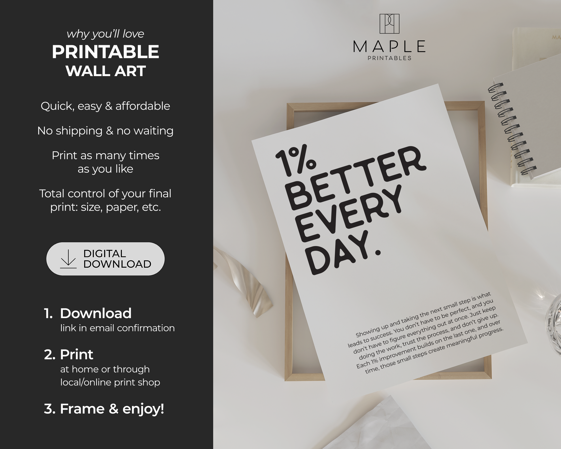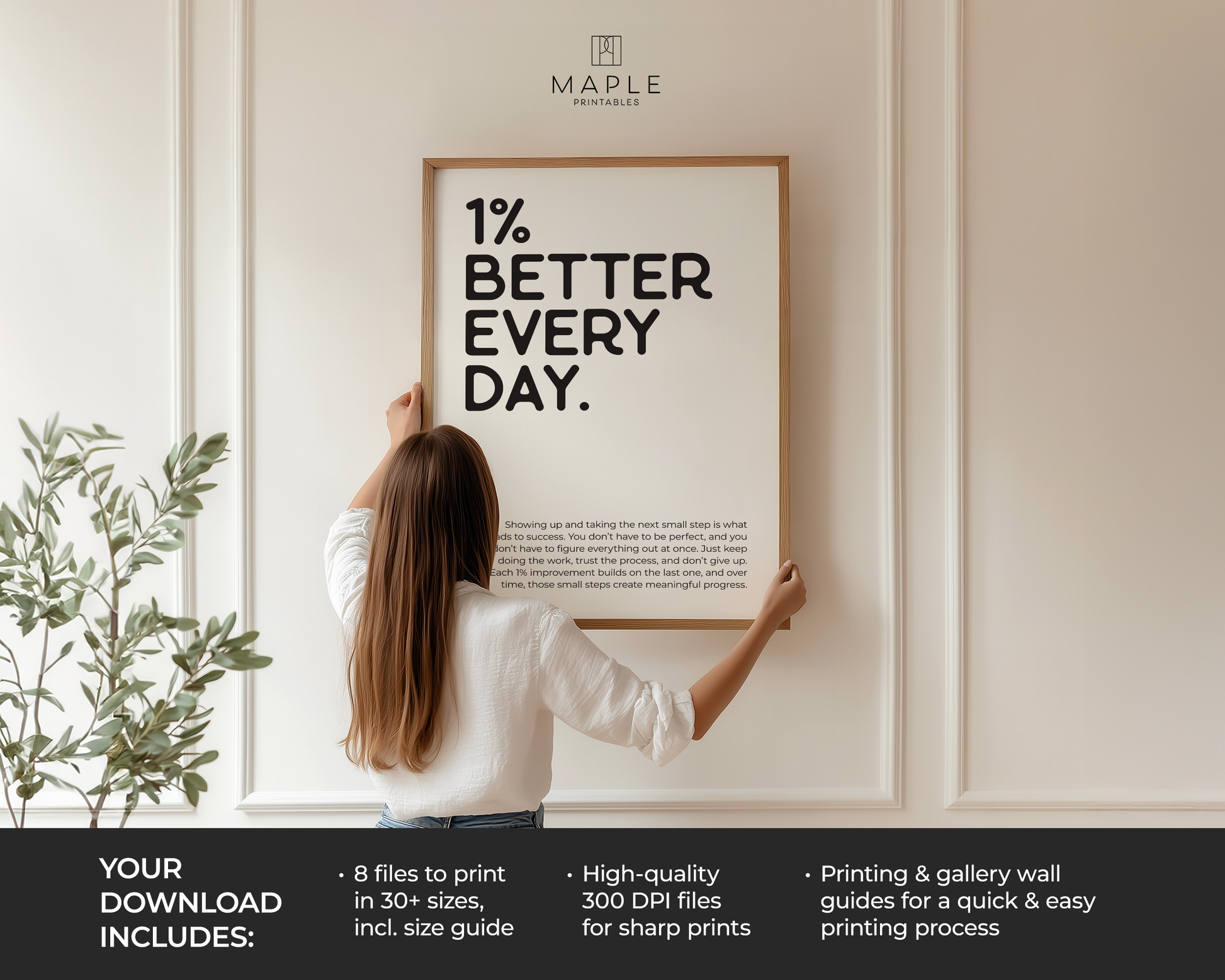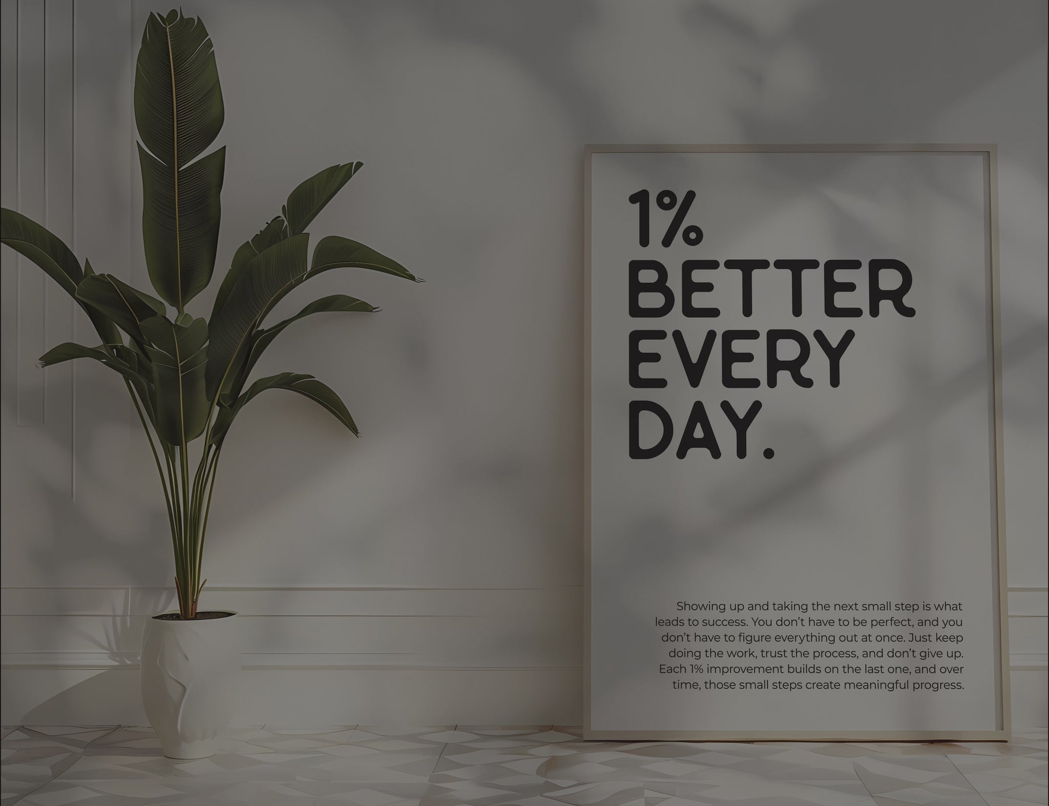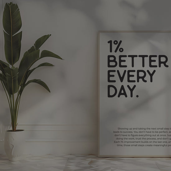 PRINTABLE WALL ART - This motivational poster says '1% better every day' and would be a great addition to your home office decor, as a reminder to trust the process because small steps move you forward, even if it doesn't feel like it. Positive quotes are a small addition that can make a big impact on your work mindset! The printable poster is minimalist, bold and trendy, and also a great option for a powerful encouragement gift :)