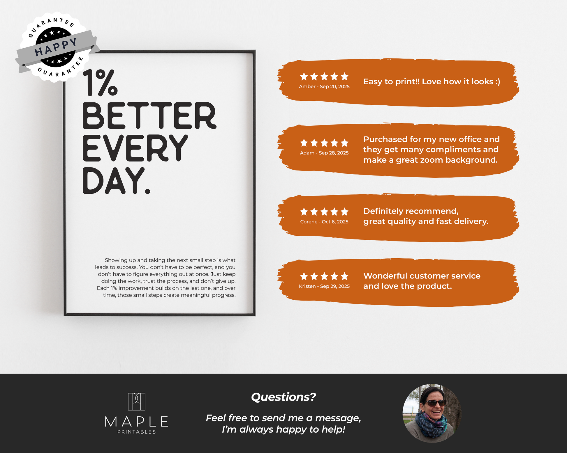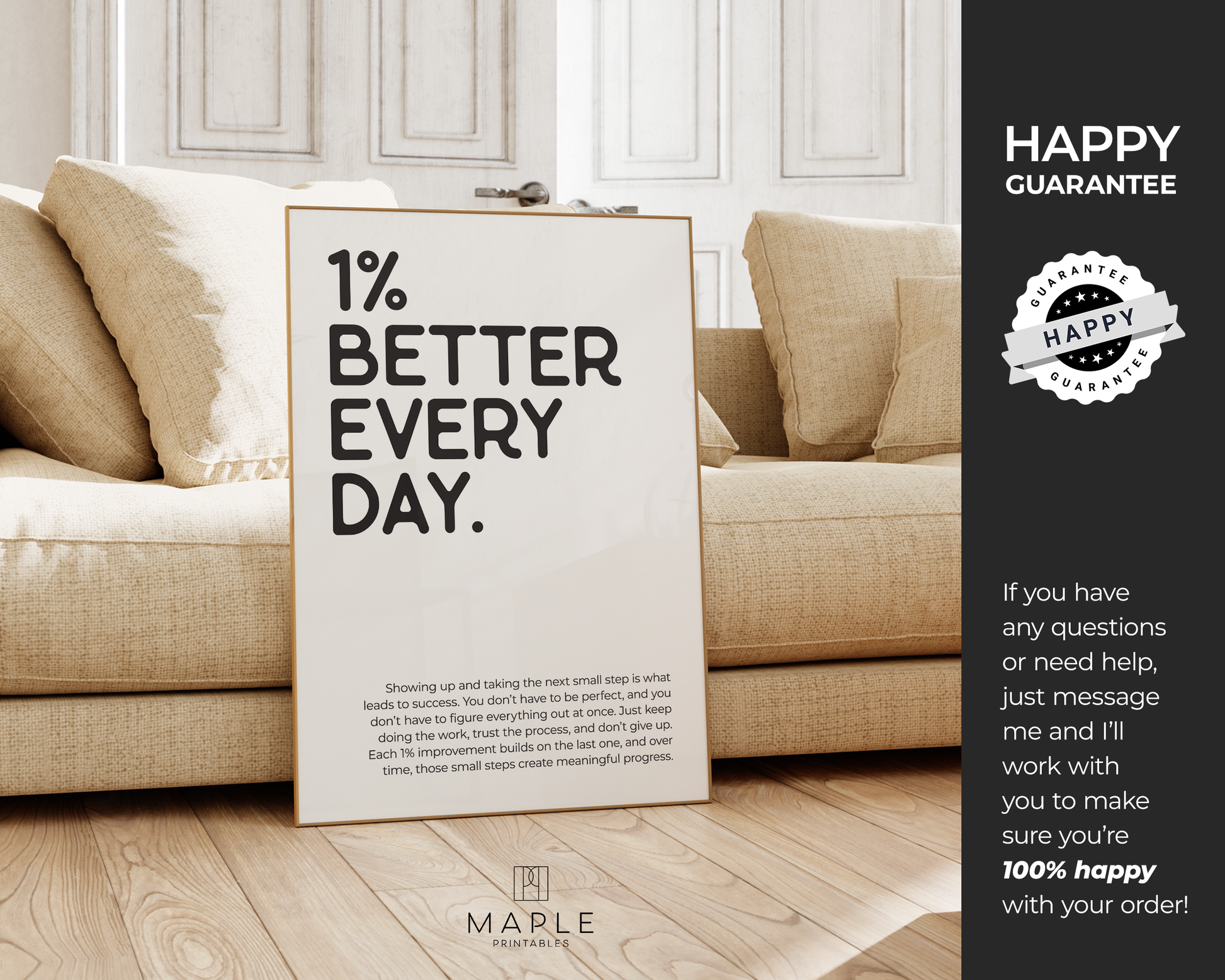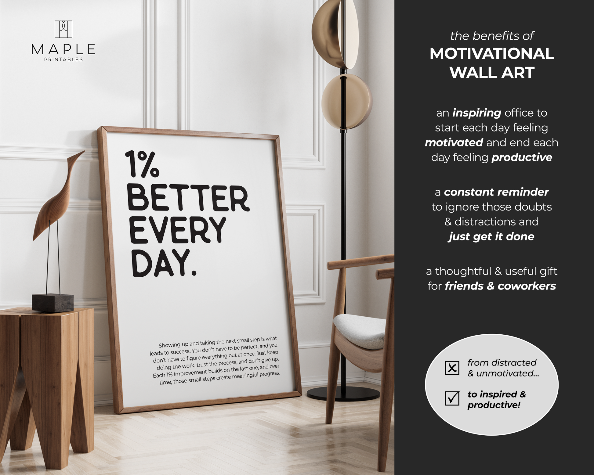 PRINTABLE WALL ART - This motivational poster says '1% better every day' and would be a great addition to your home office decor, as a reminder to trust the process because small steps move you forward, even if it doesn't feel like it. Positive quotes are a small addition that can make a big impact on your work mindset! The printable poster is minimalist, bold and trendy, and also a great option for a powerful encouragement gift :)