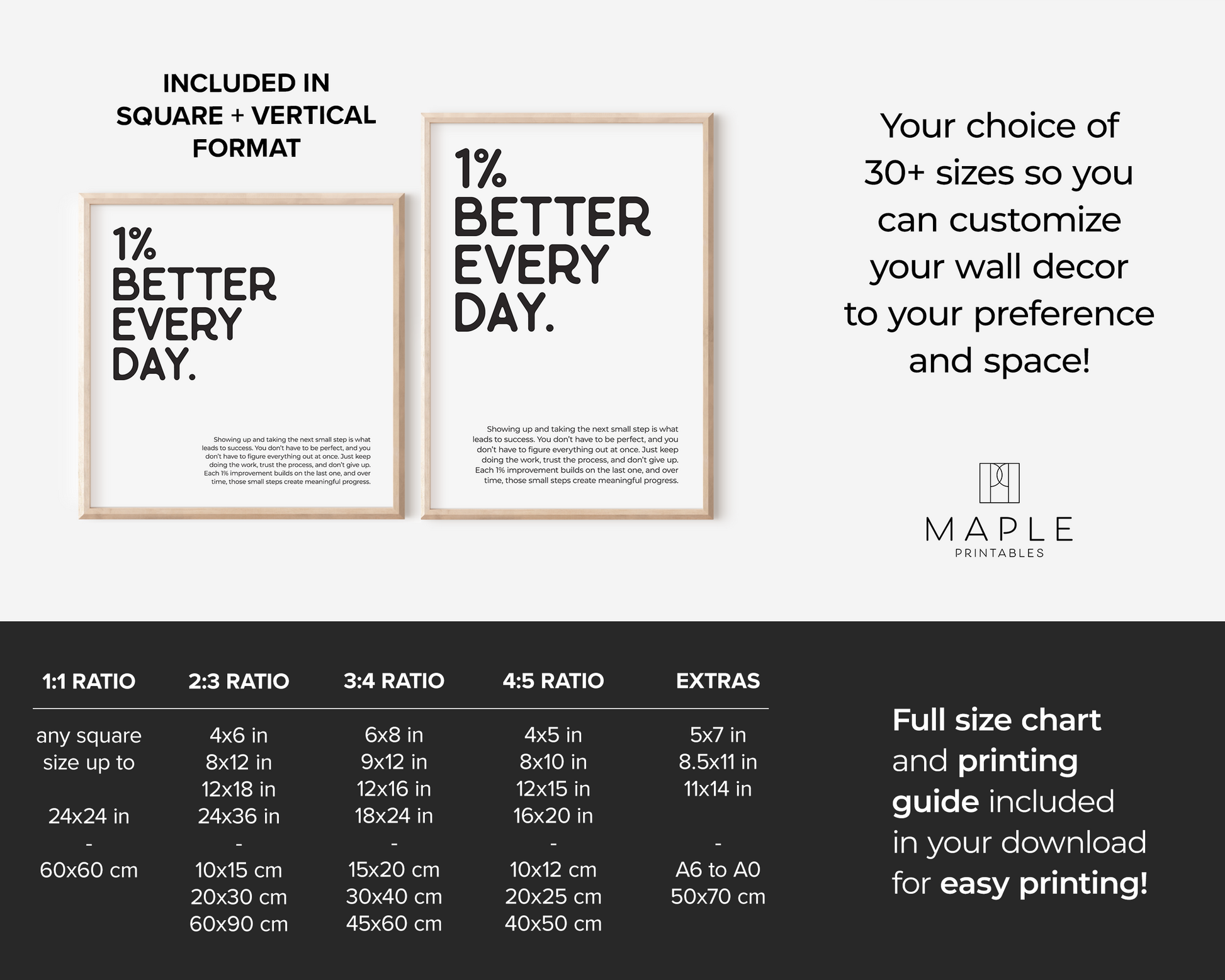 The print is available in 8 files that cover 30+ sizes. It's super easy: download, print (home, print shop or photo lab), frame and display!