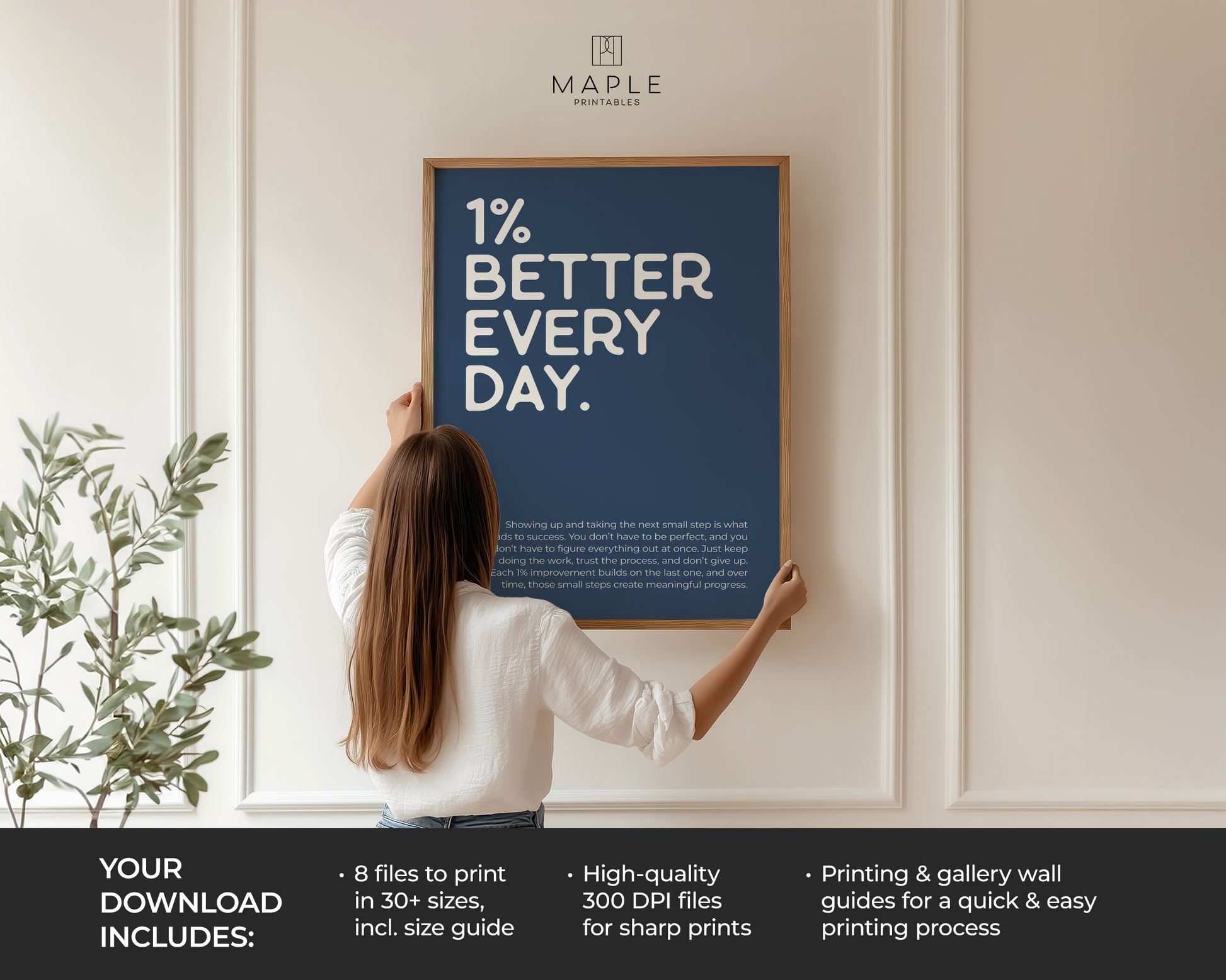 The print is available in 8 files that cover 30+ sizes. It's super easy: download, print (home, print shop or photo lab), frame and display!