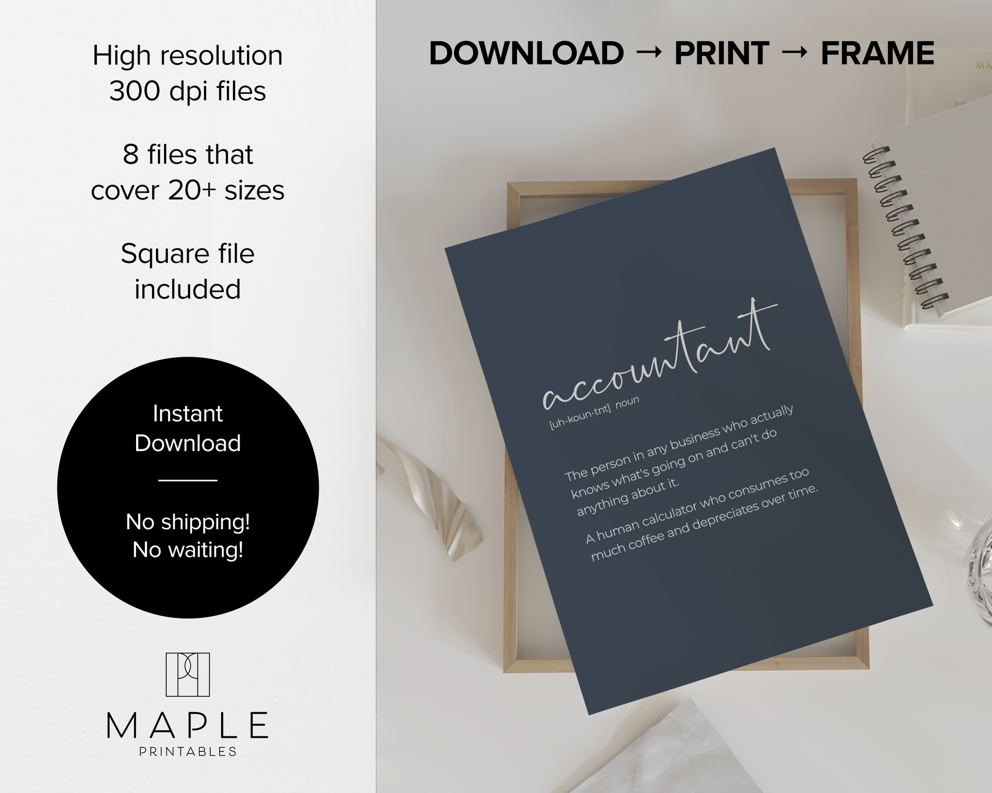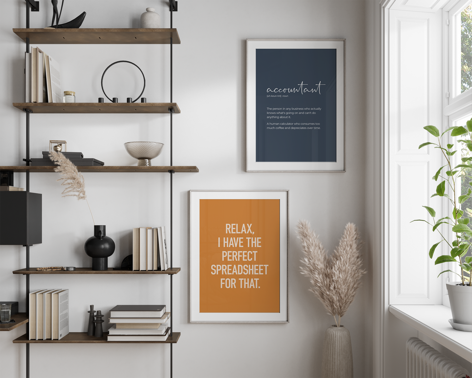 PRINTABLE SET OF 6 PRINTS - Download and print this blue, orange and yellow accounting gallery set to update your office decor in minutes. It includes 6 printables, featuring 4 funny quotes, an 'accountant' definition poser, and line art of a bundle of money bills. This would be a great gift for a CFO, CPA or anyone who works in a finance department in general - these prints would definitely add humour to their office! The bundle includes 5 vertical prints and 1 horizontal print, all available in square format as well, so you can decorate your workplace in your own style and layout!