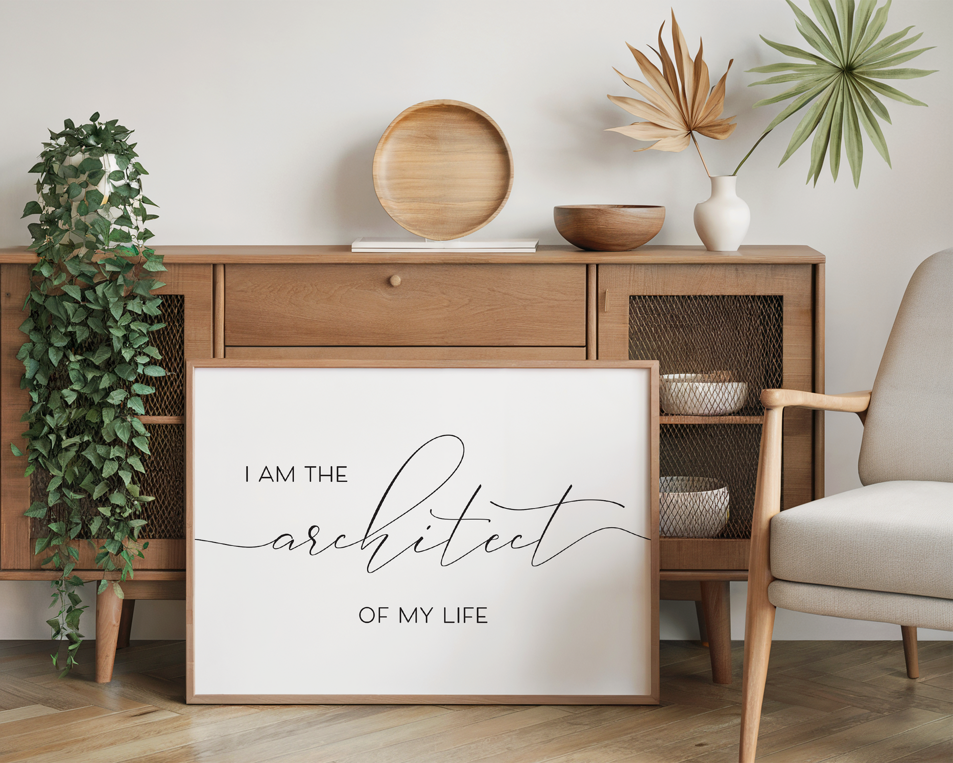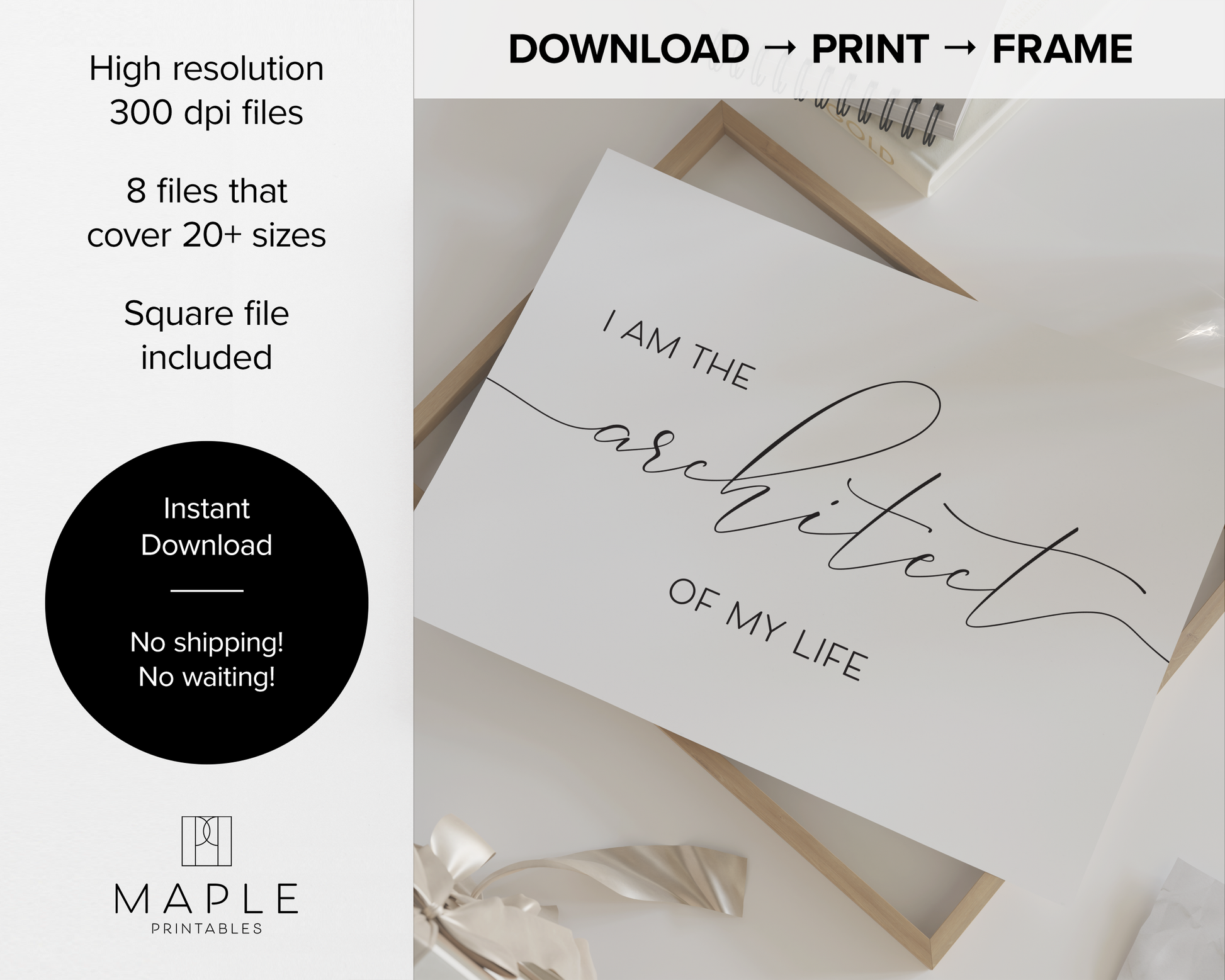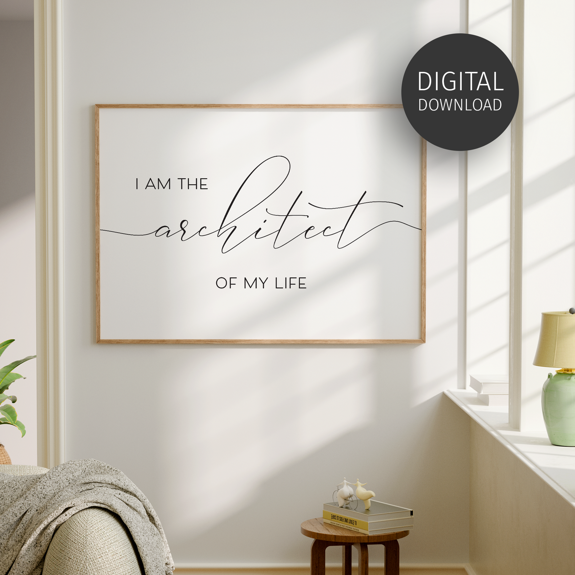 PRINTABLE WALL ART - Download and print this motivational affirmation poster to update your home office decor in minutes. The print says "I am the architect of my life" and would also be a great gift for anyone working to change their life!