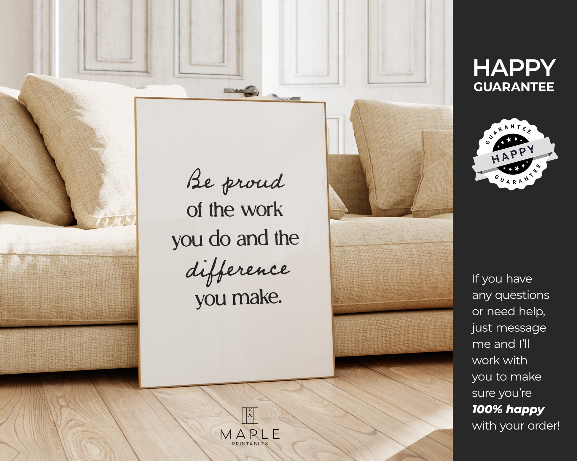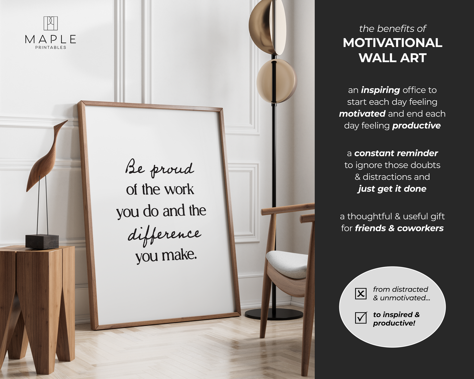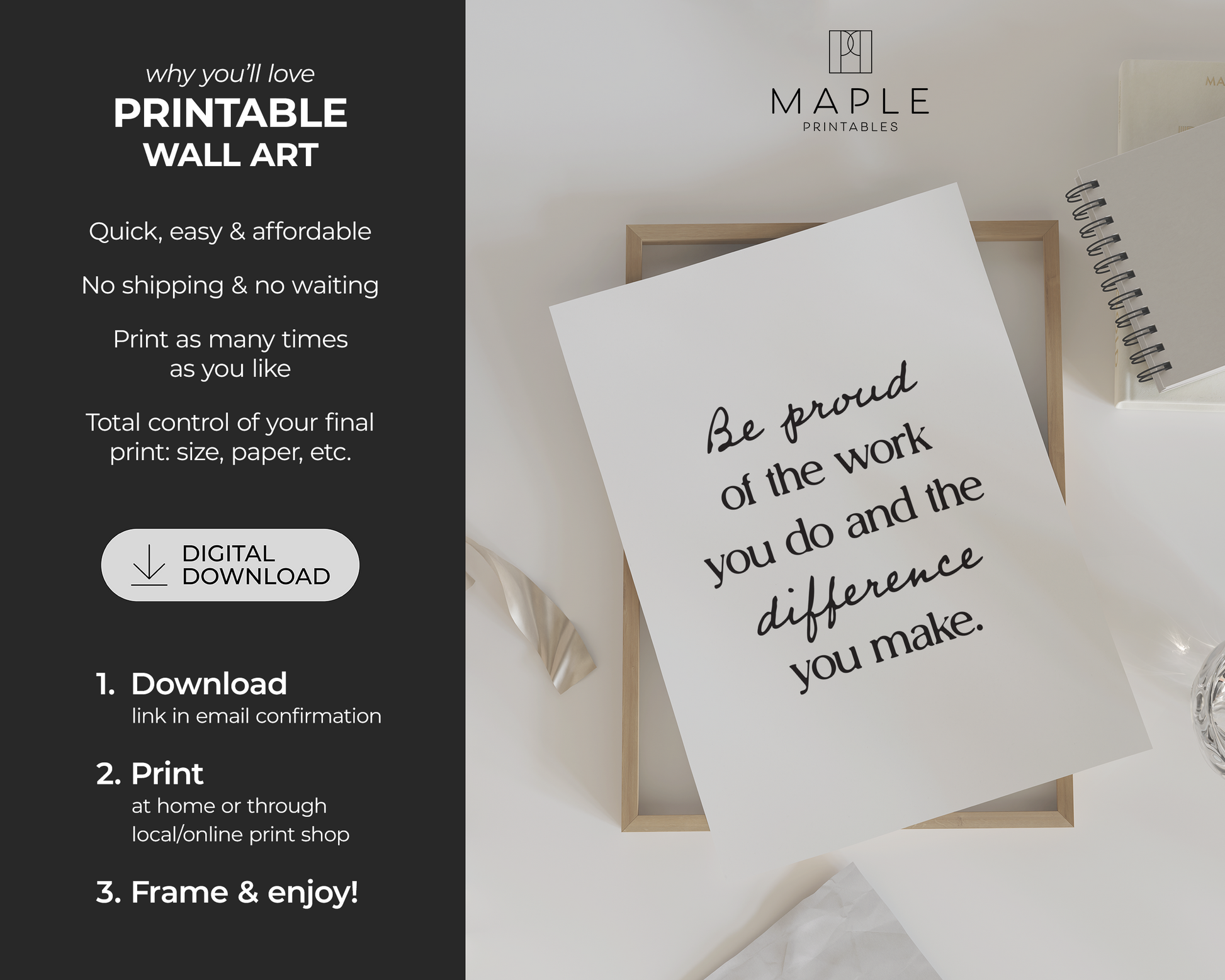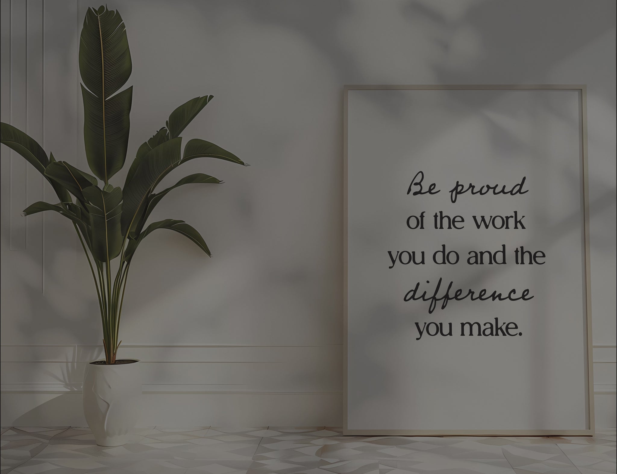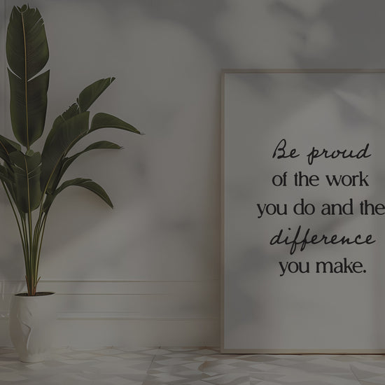 PRINTABLE WALL ART - This motivational poster says 'be proud of the work you do and the difference you make' and would be a great addition to your home office decor, as a reminder to keep a positive mindset and believe in yourself, even on tough days. Positive quotes are a small addition that can make a big impact on your work mindset! The printable poster is minimalist, bold and trendy, and also a great option for a powerful encouragement gift :)