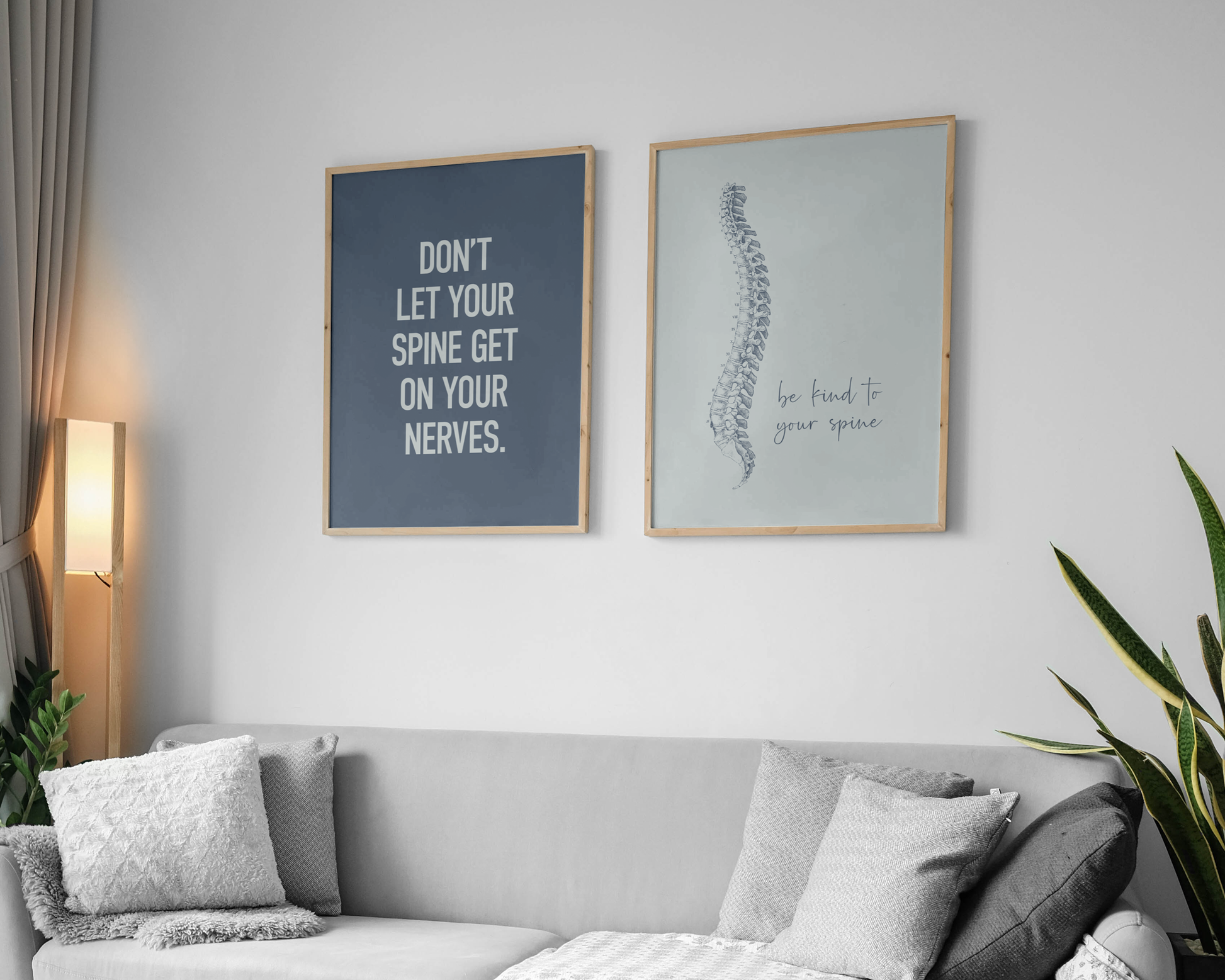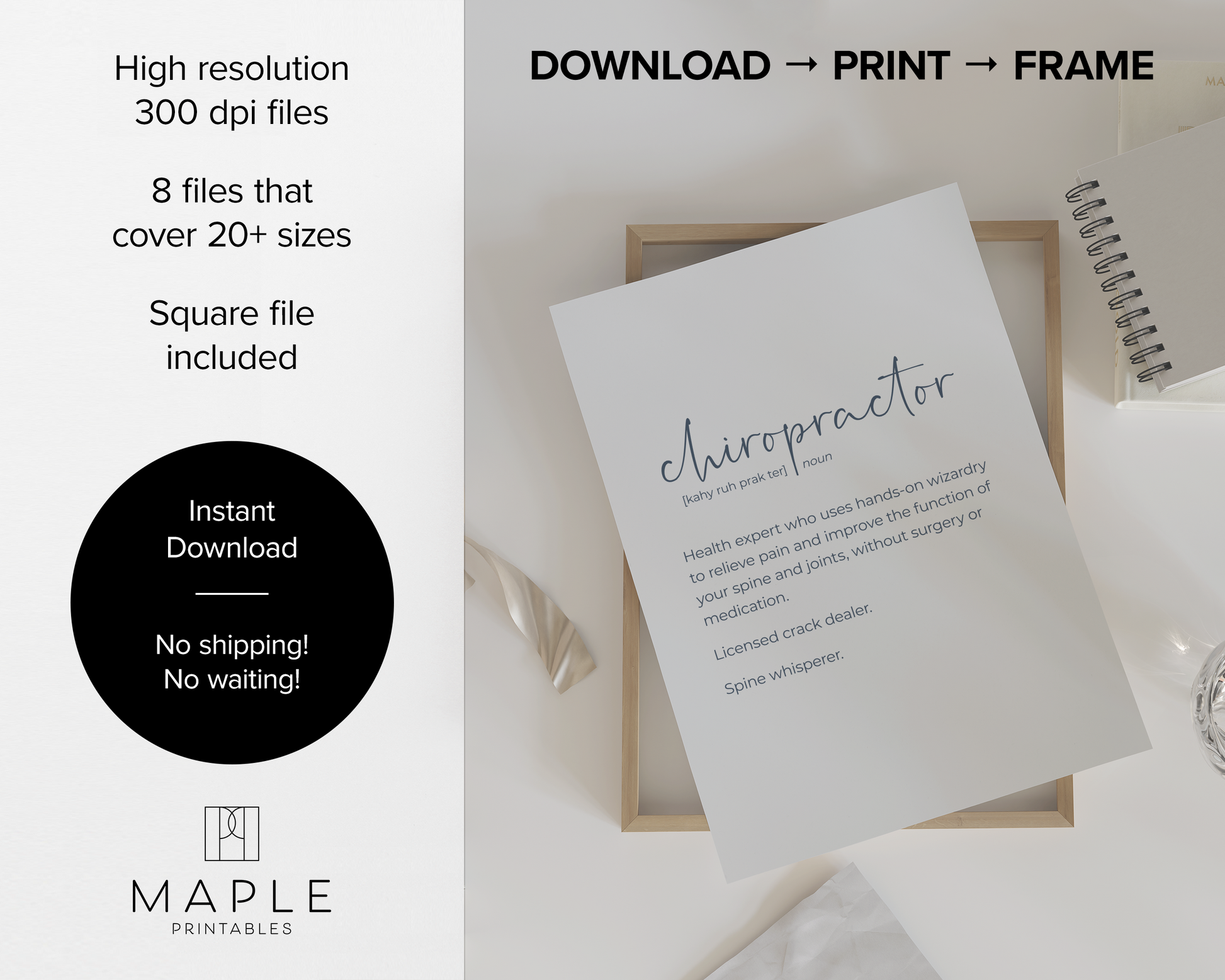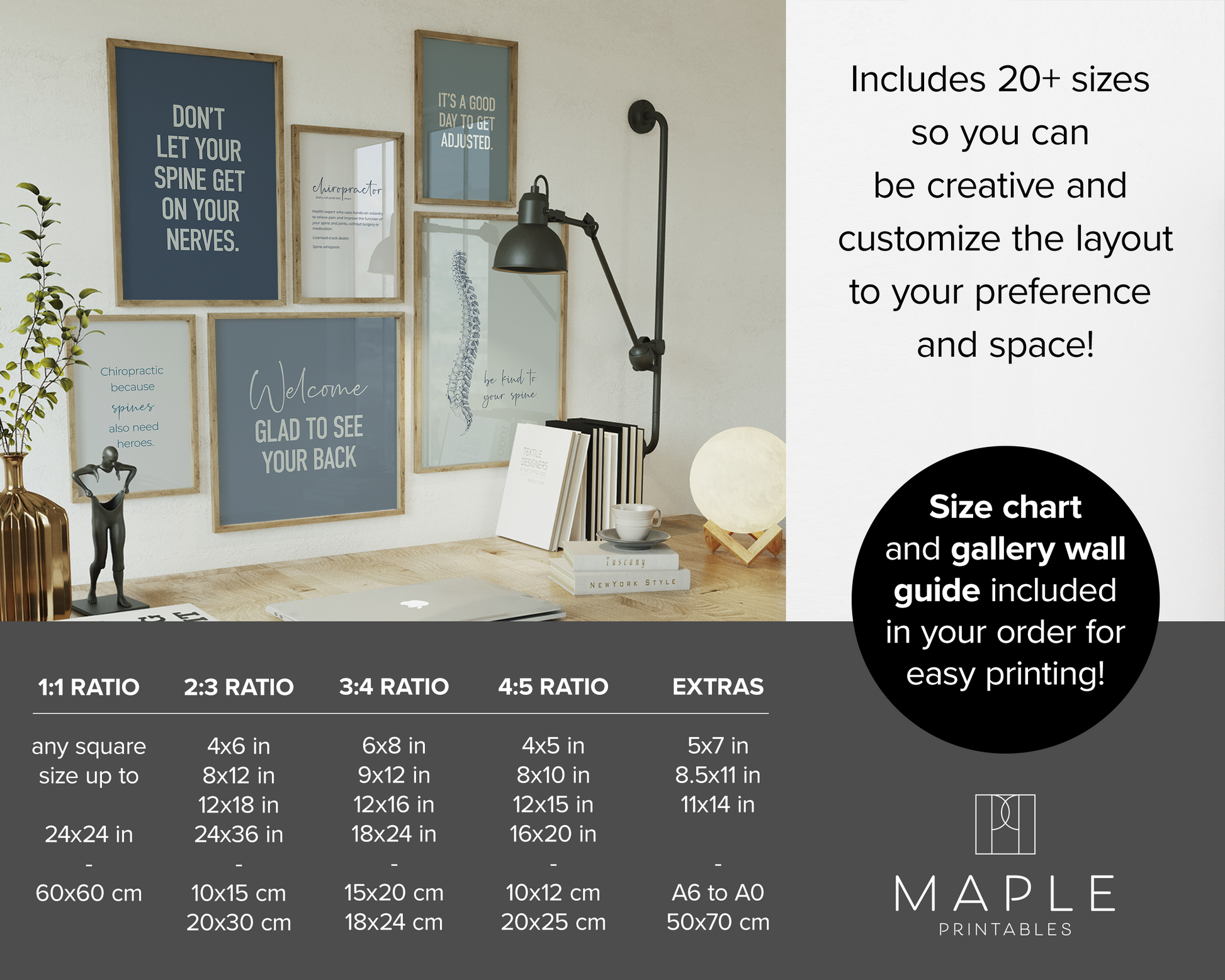 PRINTABLE SET OF 6 PRINTS - Download and print this blue chiropractic gallery set to update your office decor in minutes. It features 4 motivational and funny chiropractic quotes as well as a definition print for 'chiropractor' and an illustration of a spine. This would be a great gift for your chiro or any friends & family who are training to become chiropractors - these prints would definitely add humour to their office! The bundle includes 5 vertical prints and 1 horizontal print, all available in square format as well, so you can decorate your workplace in your own style and layout!
