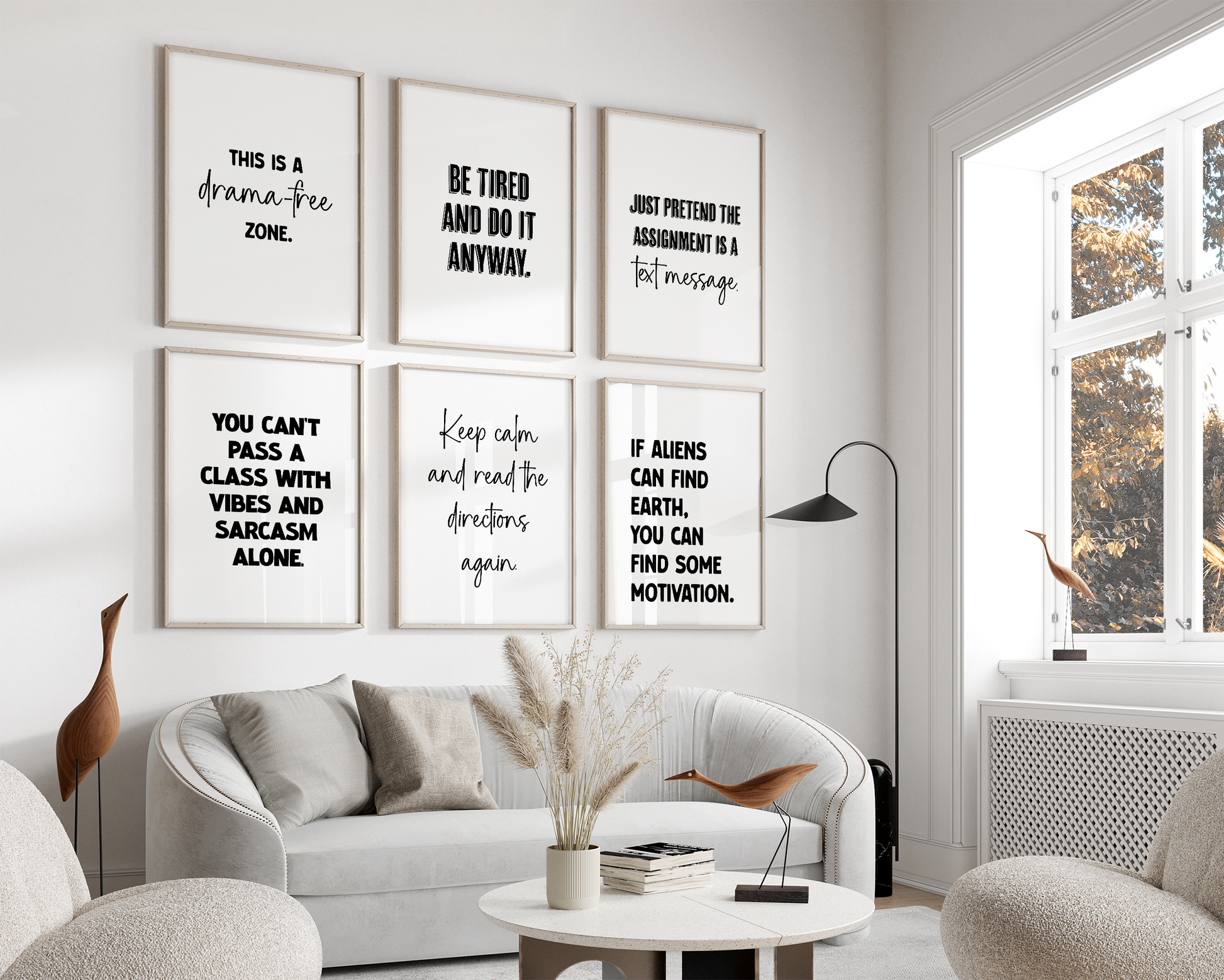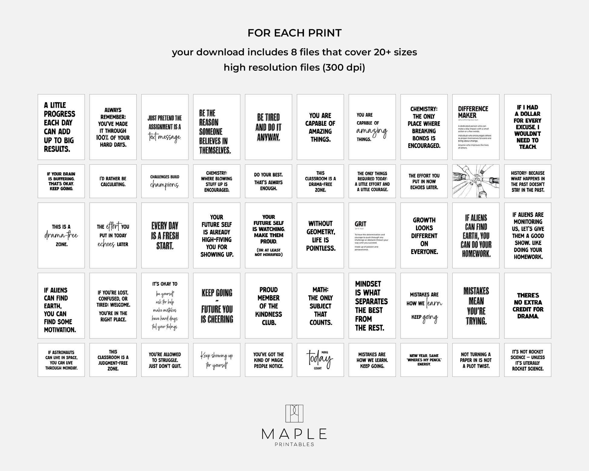 BUNDLE OF 100 PRINTABLE POSTERS - This classroom bundle includes 100 motivational, funny and sarcastic prints made for teens. These posters bring personality, encouragement, and just the right amount of edge to your classroom walls, while keeping students entertained. You'll find a mix of uplifting quotes plus clever takes on history, science, chemistry and math. It makes a super fun back-to-school gift for yourself or the teachers and guidance counsellors in your life!