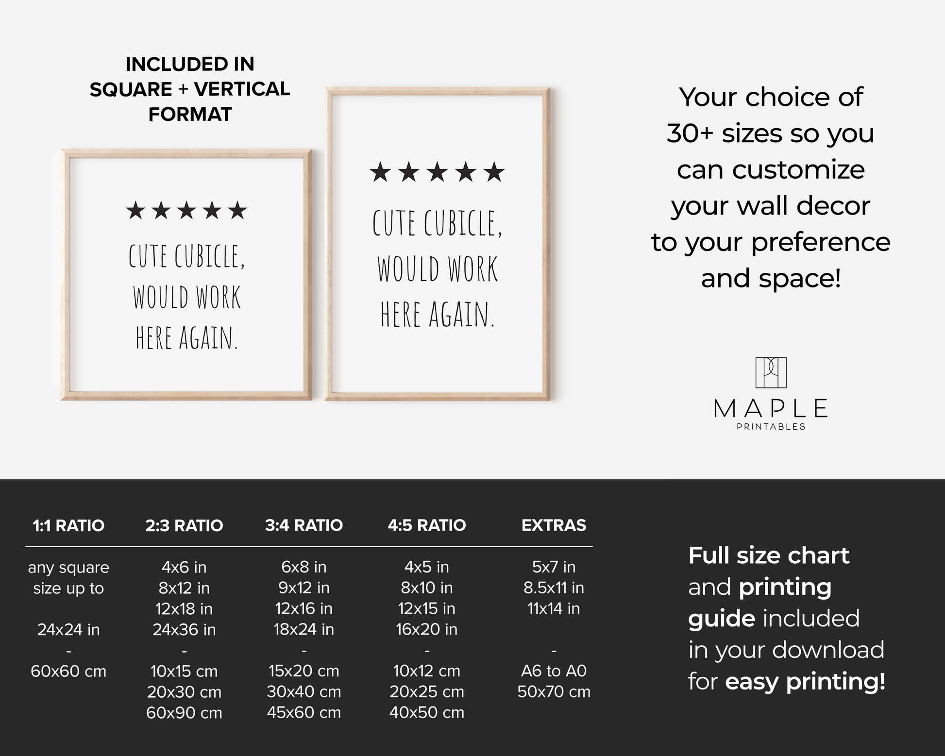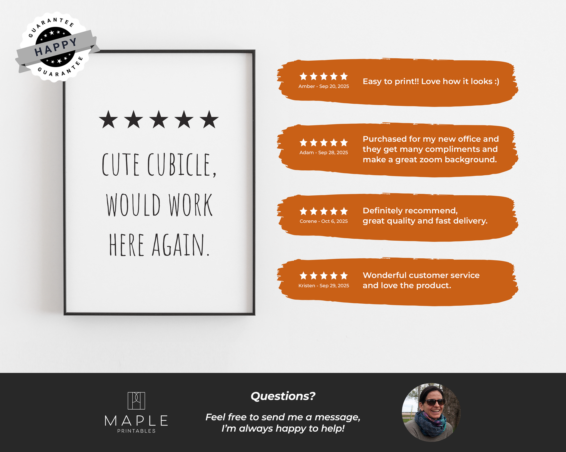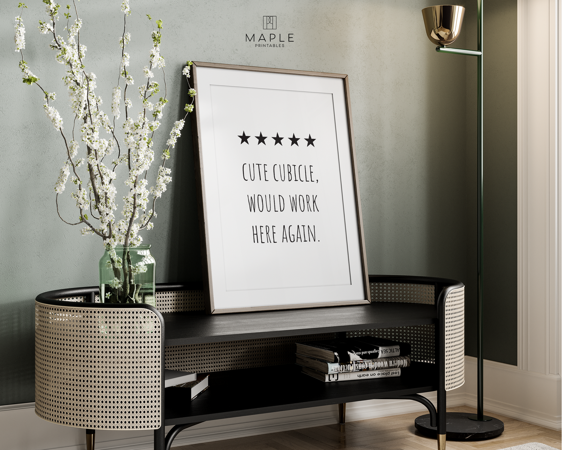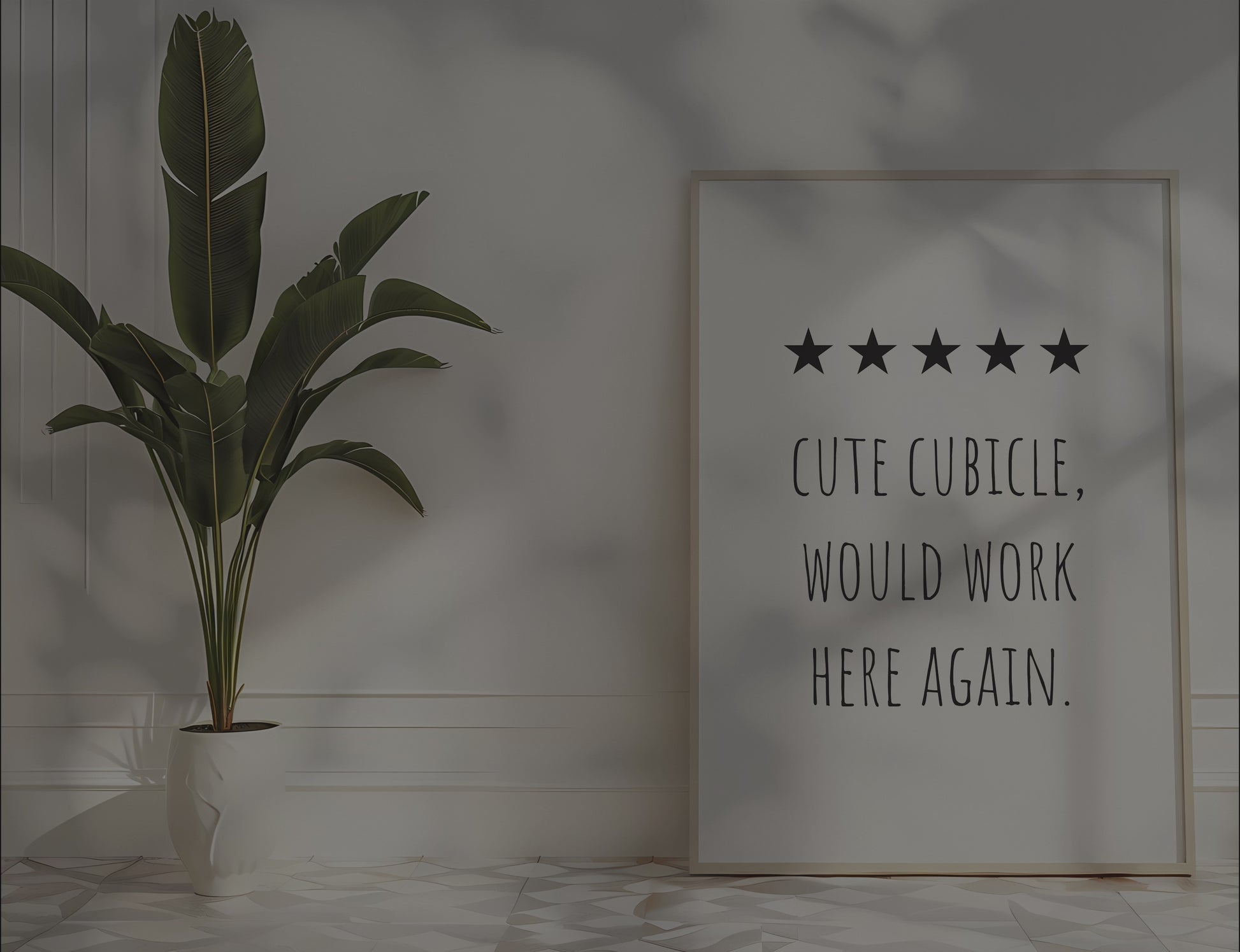 PRINTABLE WALL ART - Add a little motivational humour to your office decor with this poster that says “Cute cubicle, would work here again” with a 5-star review. It’s a fun, lighthearted quote that anyone with a desk, cubicle, or office space can relate to. The clean black and white design keeps it simple and modern, making it easy to display in cubicles. A great piece of funny office wall art that brings personality to the workspace while keeping the decor minimal and professional.