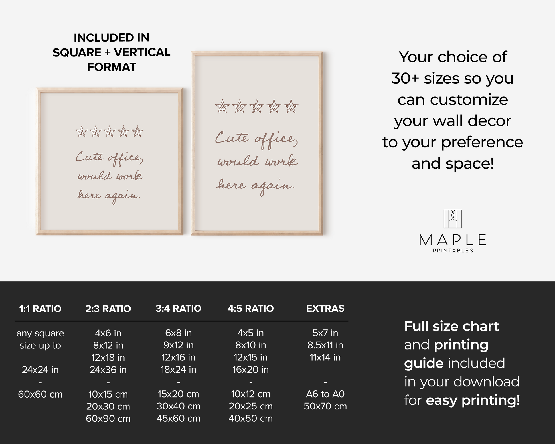 The print is available in 8 files that cover 30+ sizes. It's super easy: download, print (home, print shop or photo lab), frame and display!