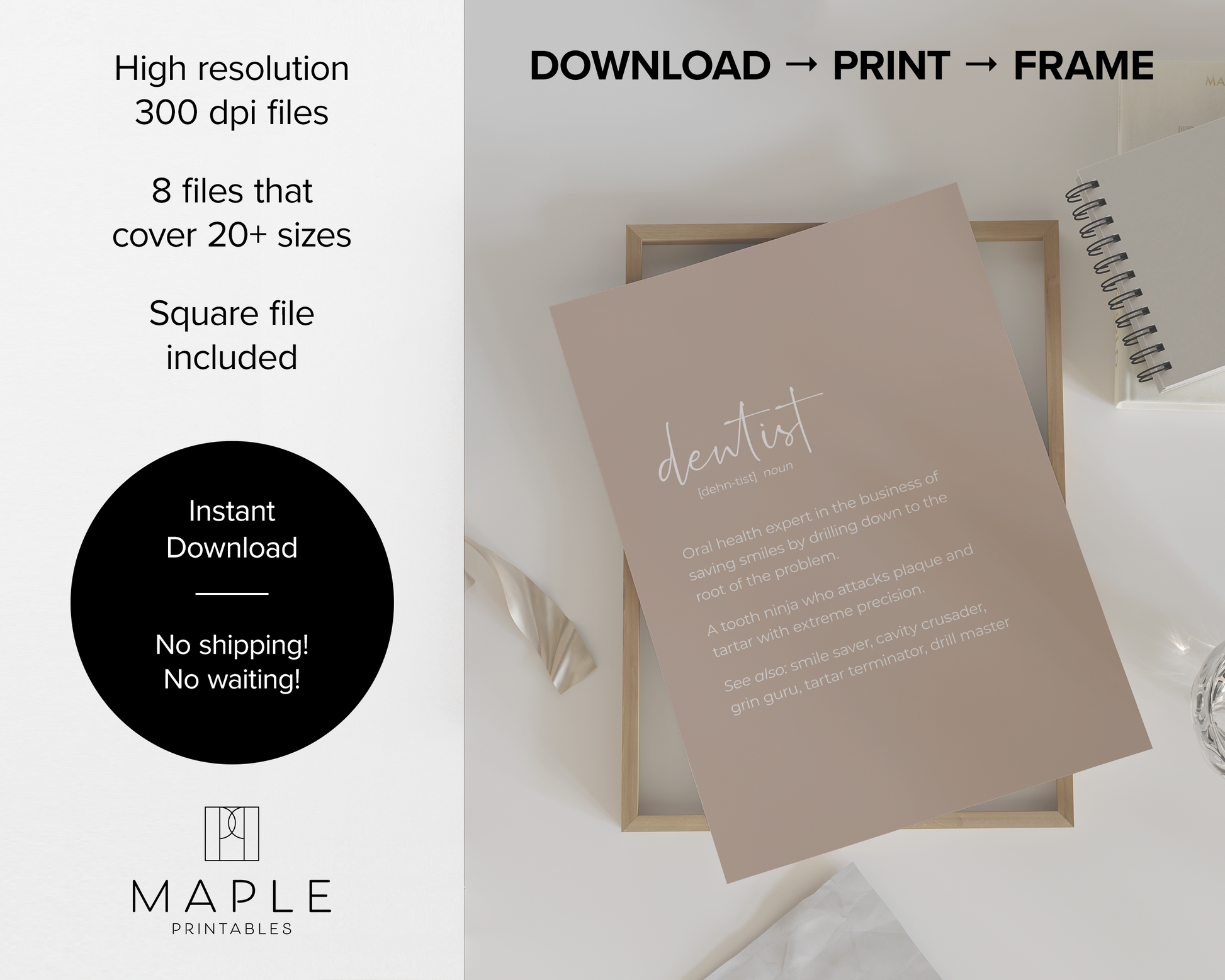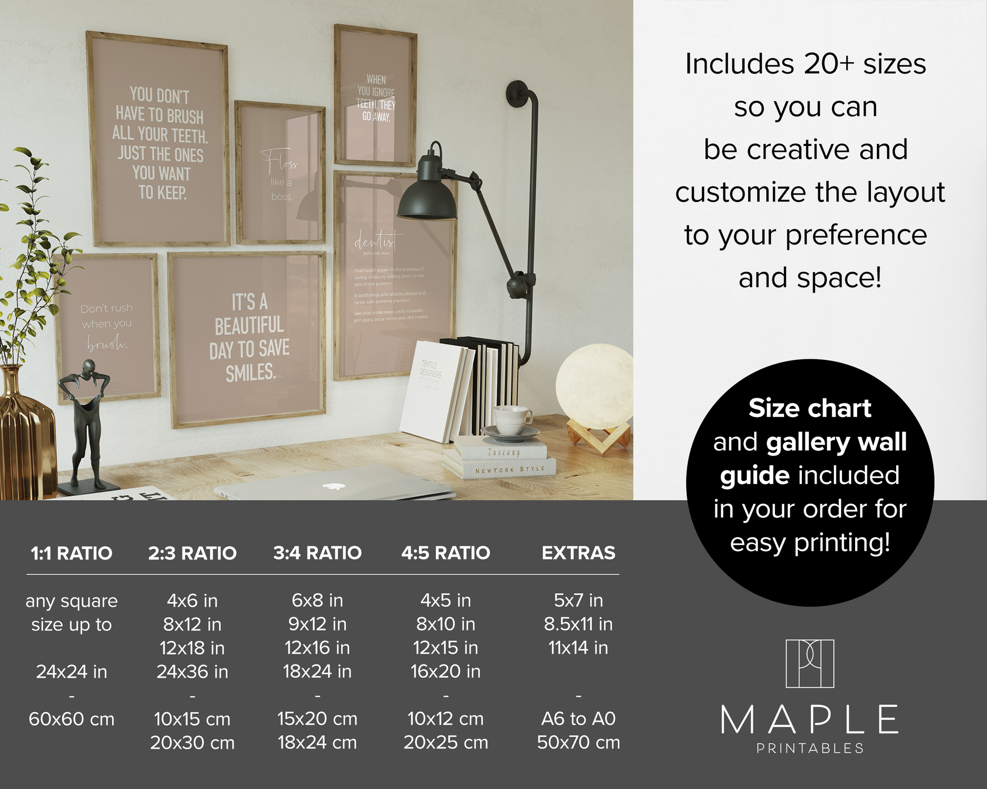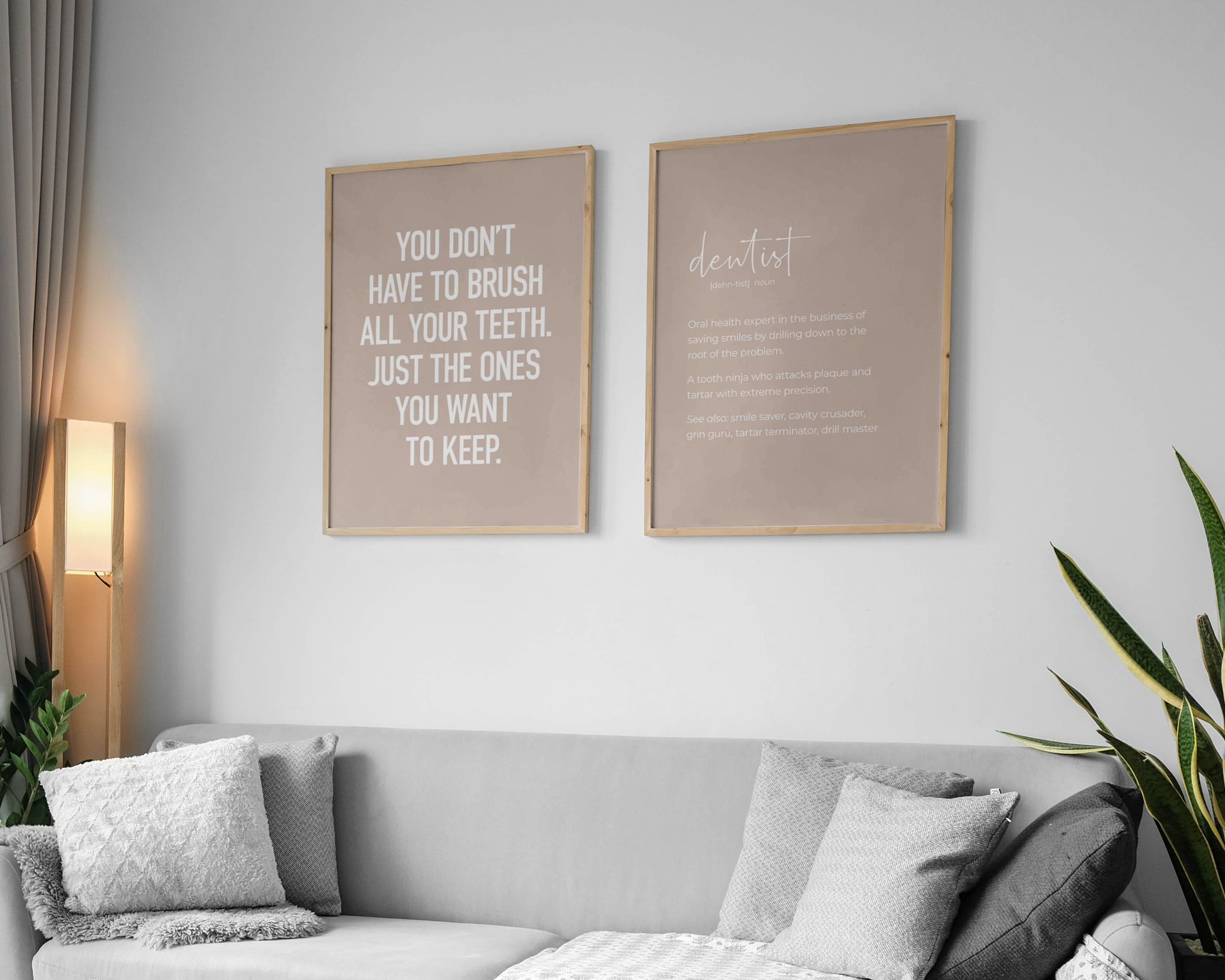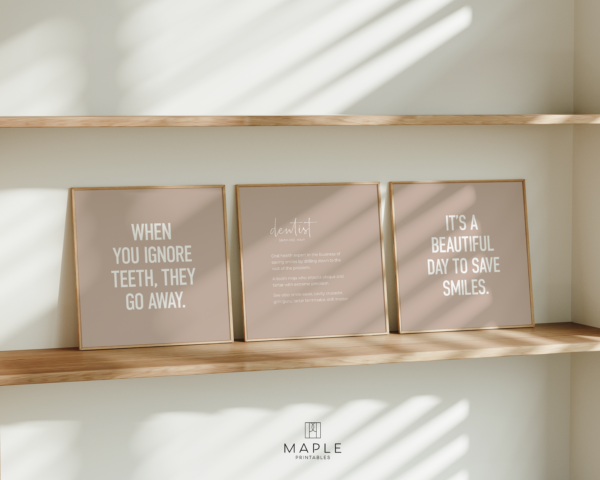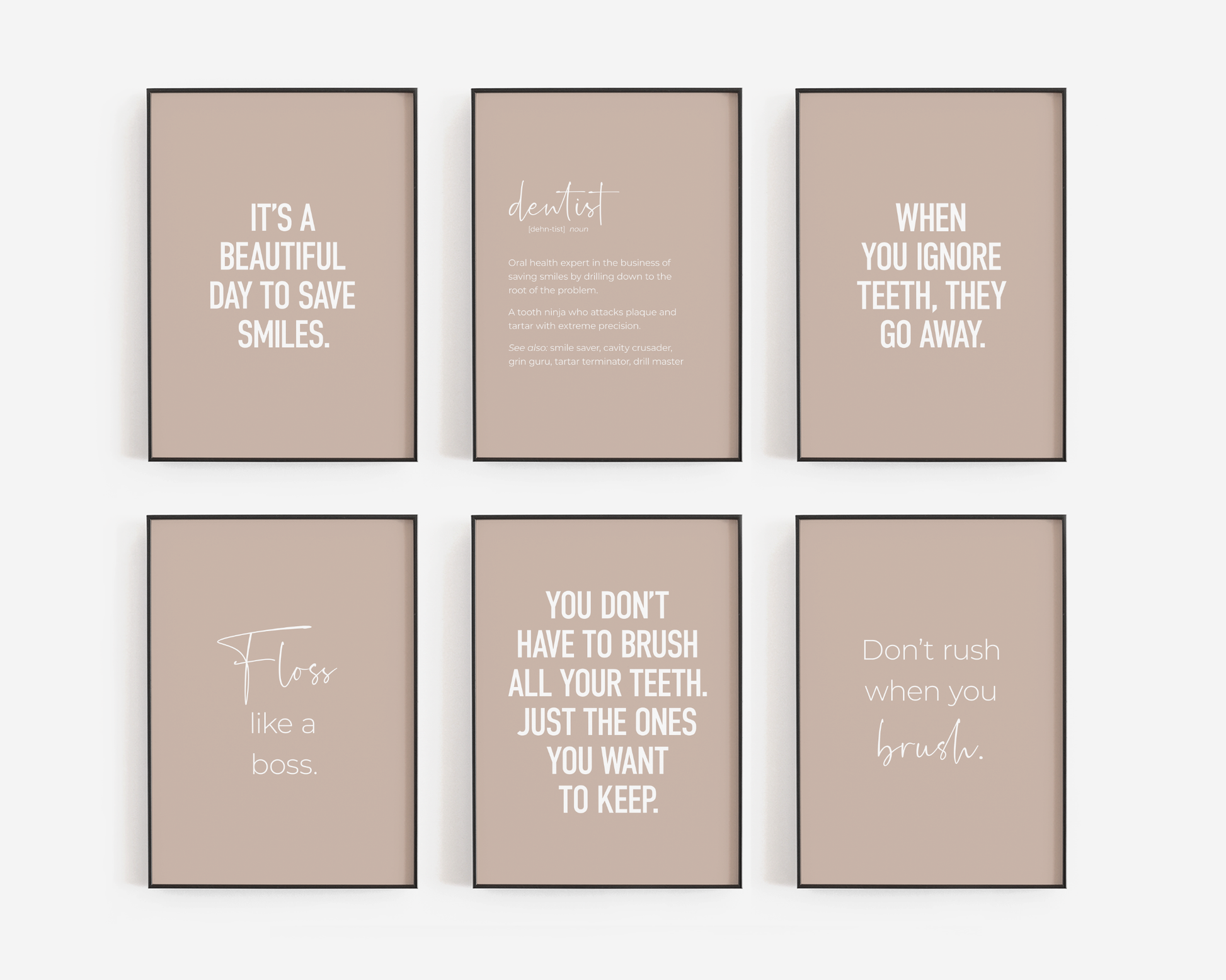 PRINTABLE SET OF 6 PRINTS - Download and print this beige gallery set to update your dental office decor in minutes. It features 5 funny dentistry quotes as well as a definition poster of 'dentist'. This would be a great gift for your dentist or any friends & family who are training to become dentists - these prints would definitely add humour to their office! The bundle includes 6 vertical prints, available in square format as well, so you can decorate your workplace in your own style and layout!