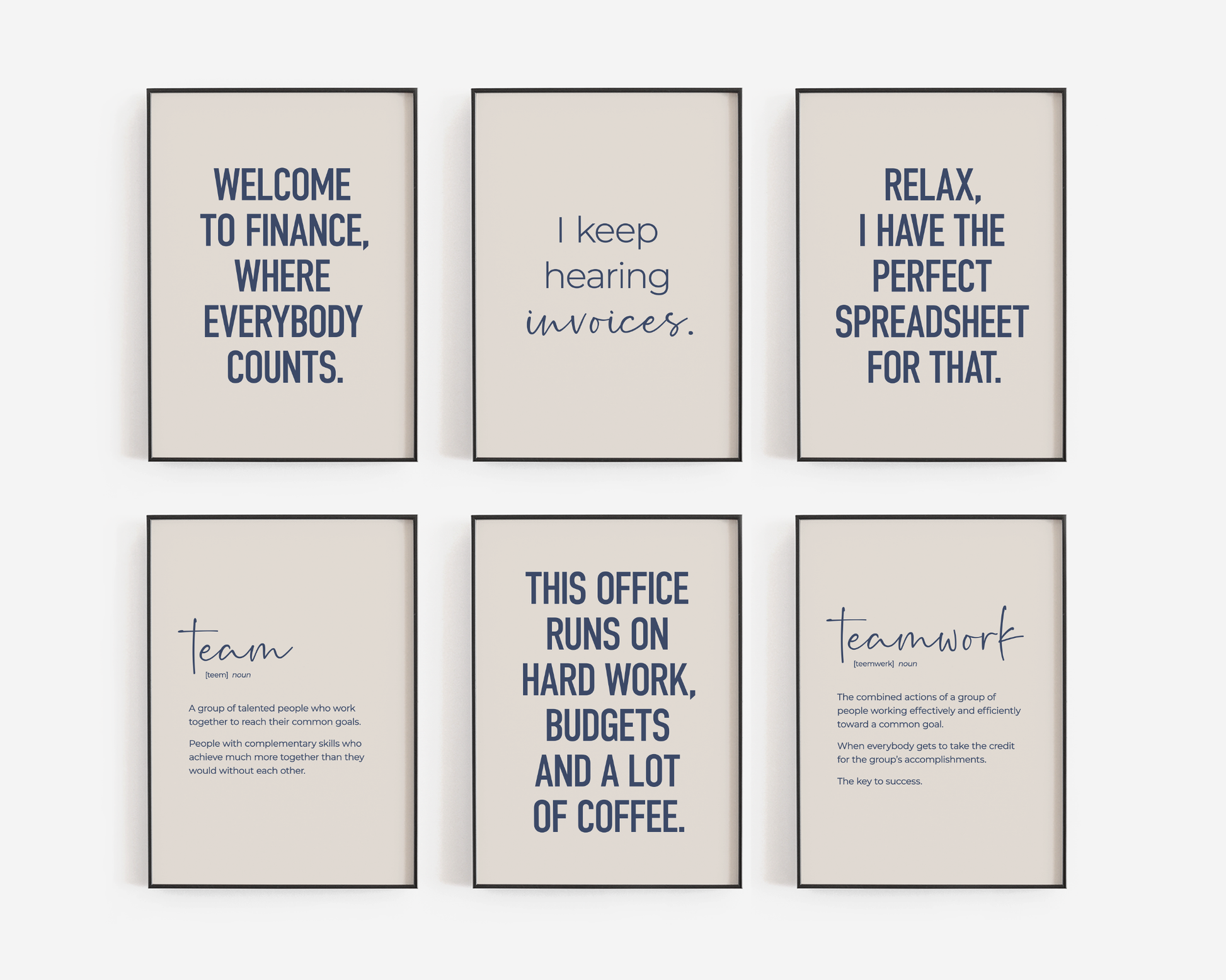 PRINTABLE SET OF 6 PRINTS - Download and print this accounting gallery set to refresh your office decor in minutes. It includes printables, featuring 4 funny quotes as well as 'team' and 'teamwork' definition posters. This would be a great gift for a CFO, CPA or anyone who works in a finance department in general - these prints would definitely add humour to their office! The bundle includes 6 vertical prints, all available in square format as well so you can decorate your workplace in your own style and layout!