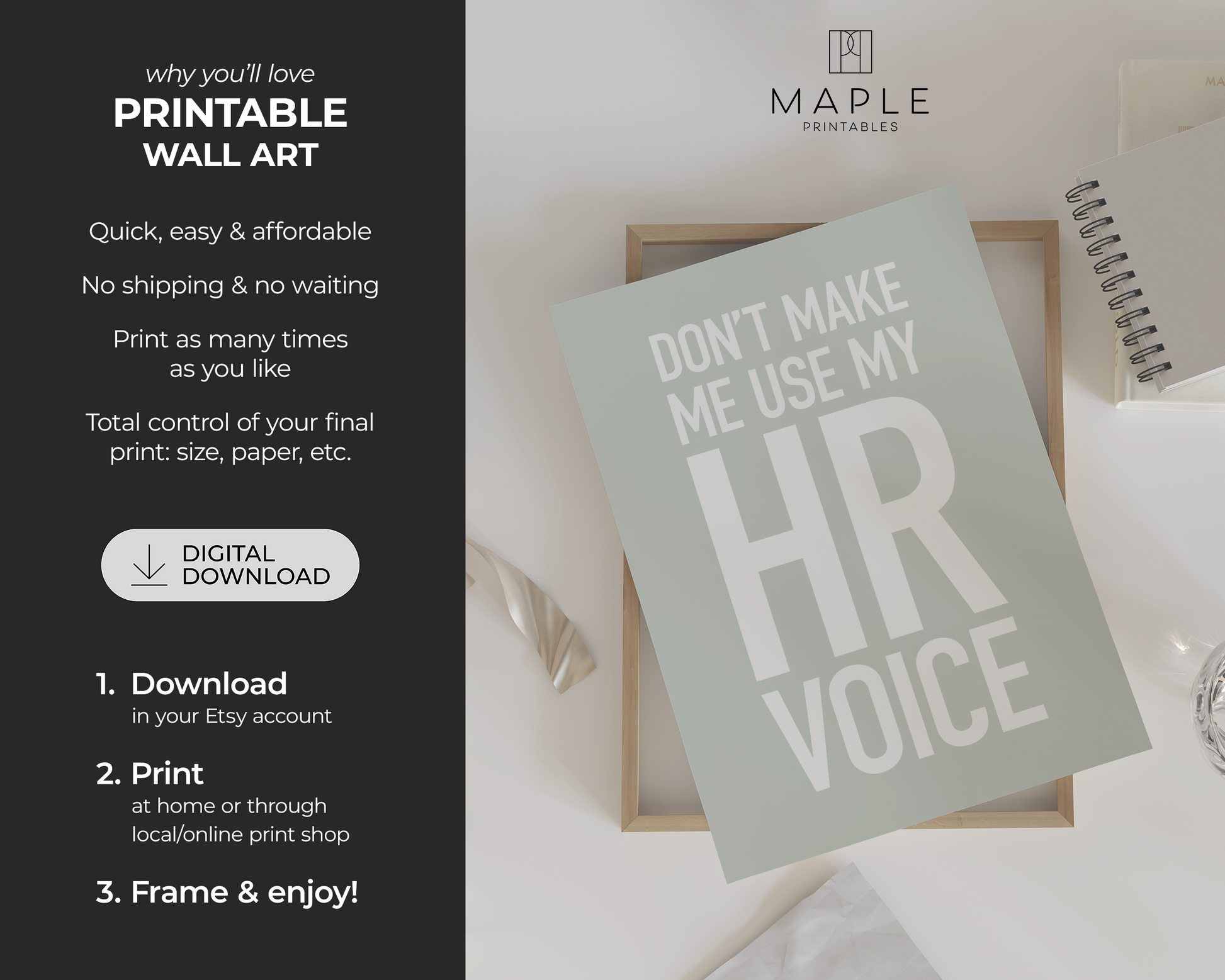 BUNDLE OF 50 PRINTABLE POSTERS - Bring some personality to your HR office decor with this bundle of 50 posters in pastel earth tones, featuring a mix of funny HR quotes and motivational teamwork & leadership sayings. The minimalist, typography-based designs keep things clean and professional while adding a bit of humour and positivity to the workspace. These prints are perfect for HR offices, staff rooms, corporate workspaces and home offices. The combination of Human Resources humour and motivational office quotes helps create a welcoming environment while encouraging teamwork, communication, and a positive workplace mindset.