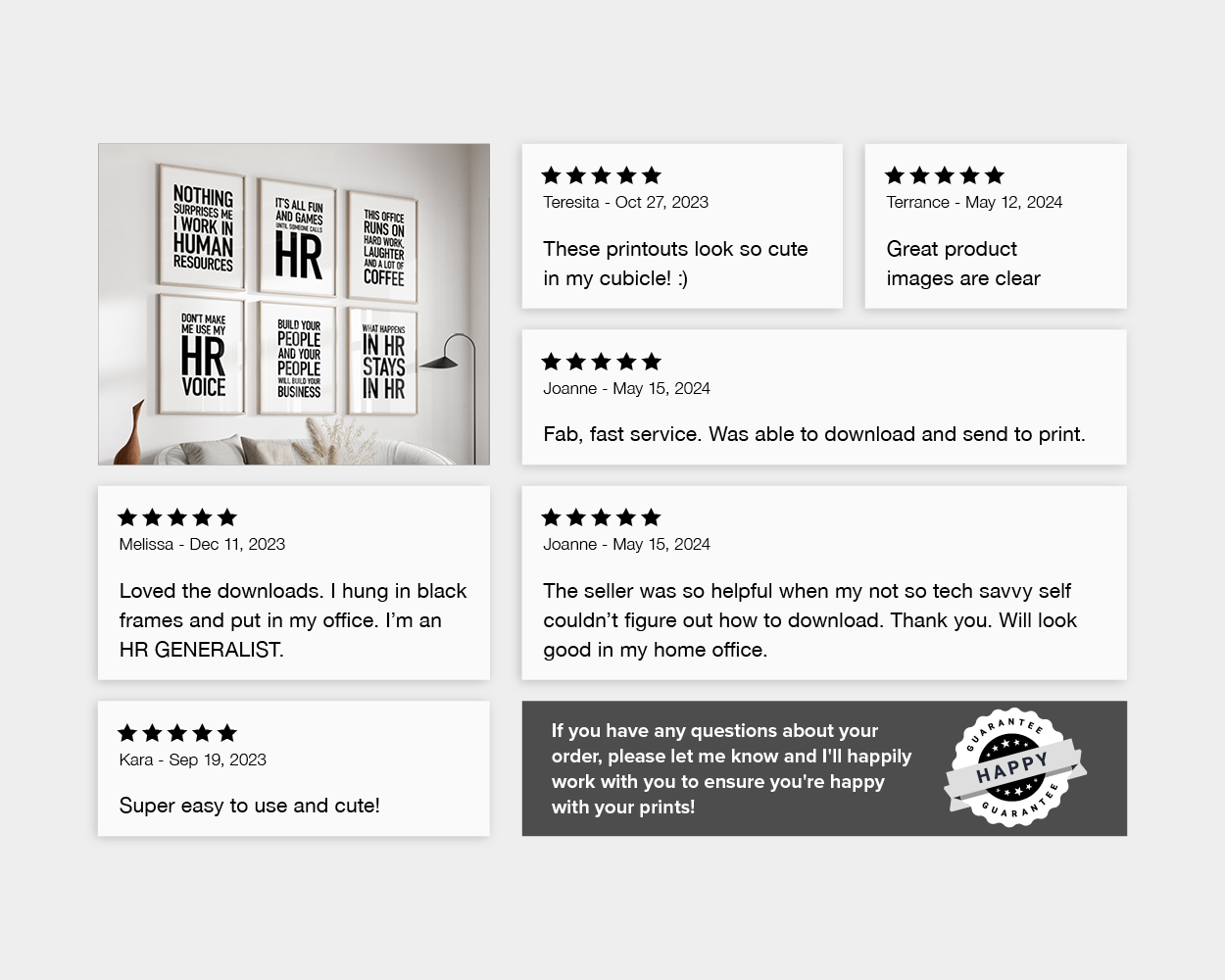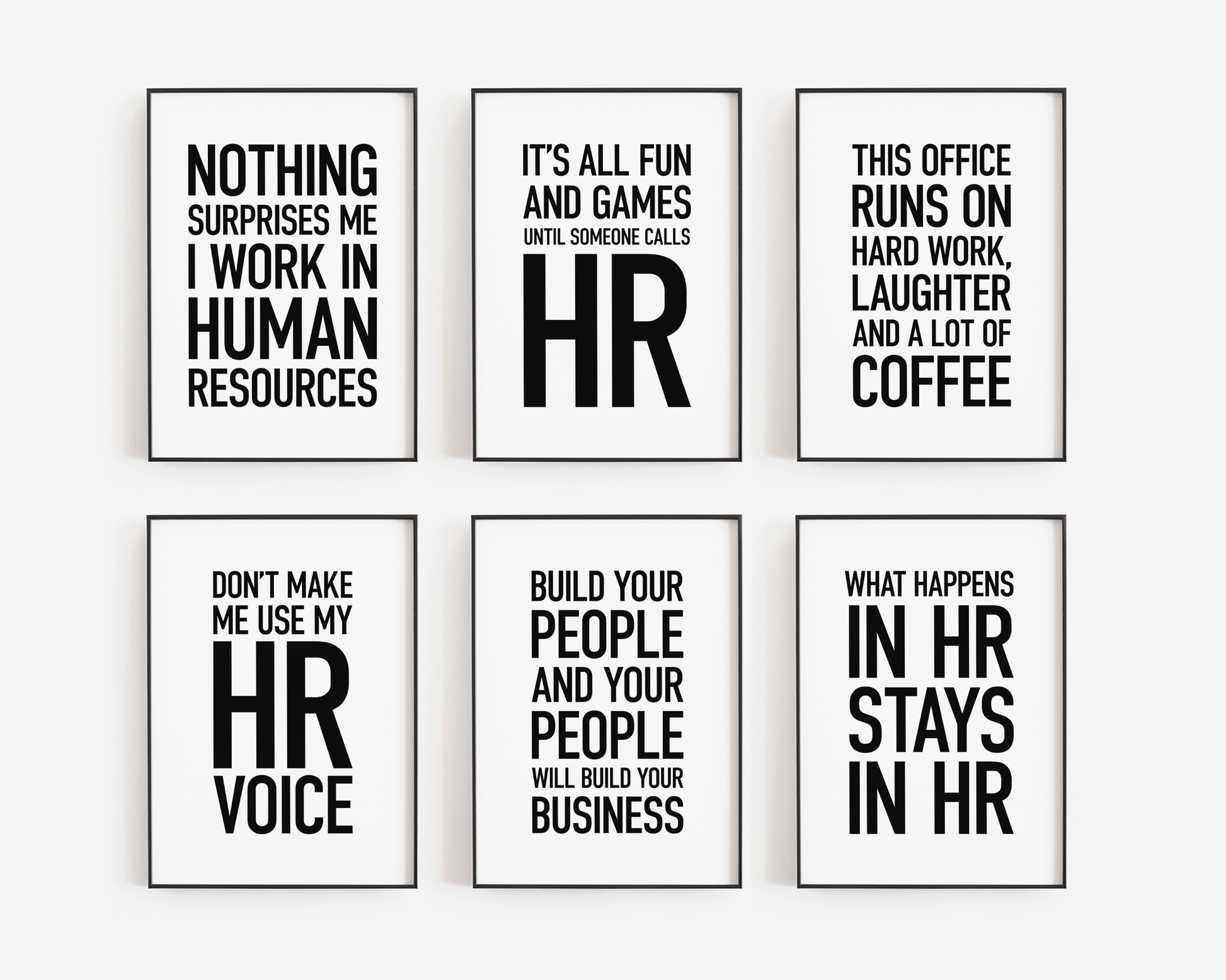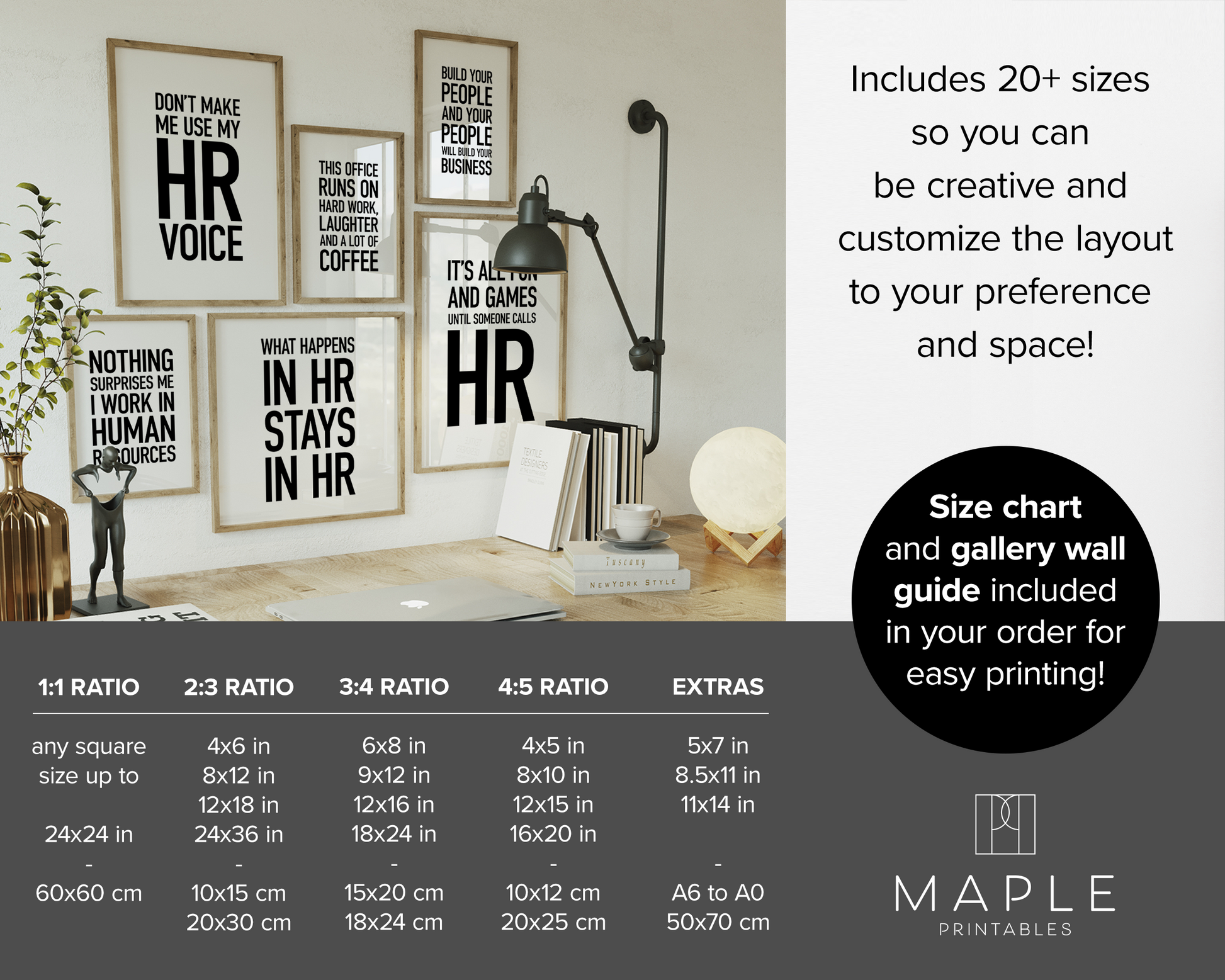 PRINTABLE SET OF 6 PRINTS - Download and print this HR gallery set to update your office decor in minutes. It includes 6 printables in vertical and square format so you can make it yours and decorate your office in your own style and layout. This is a great decor idea to add a little HR appreciation to a Human Resources department, and it also makes for a super funny gift!