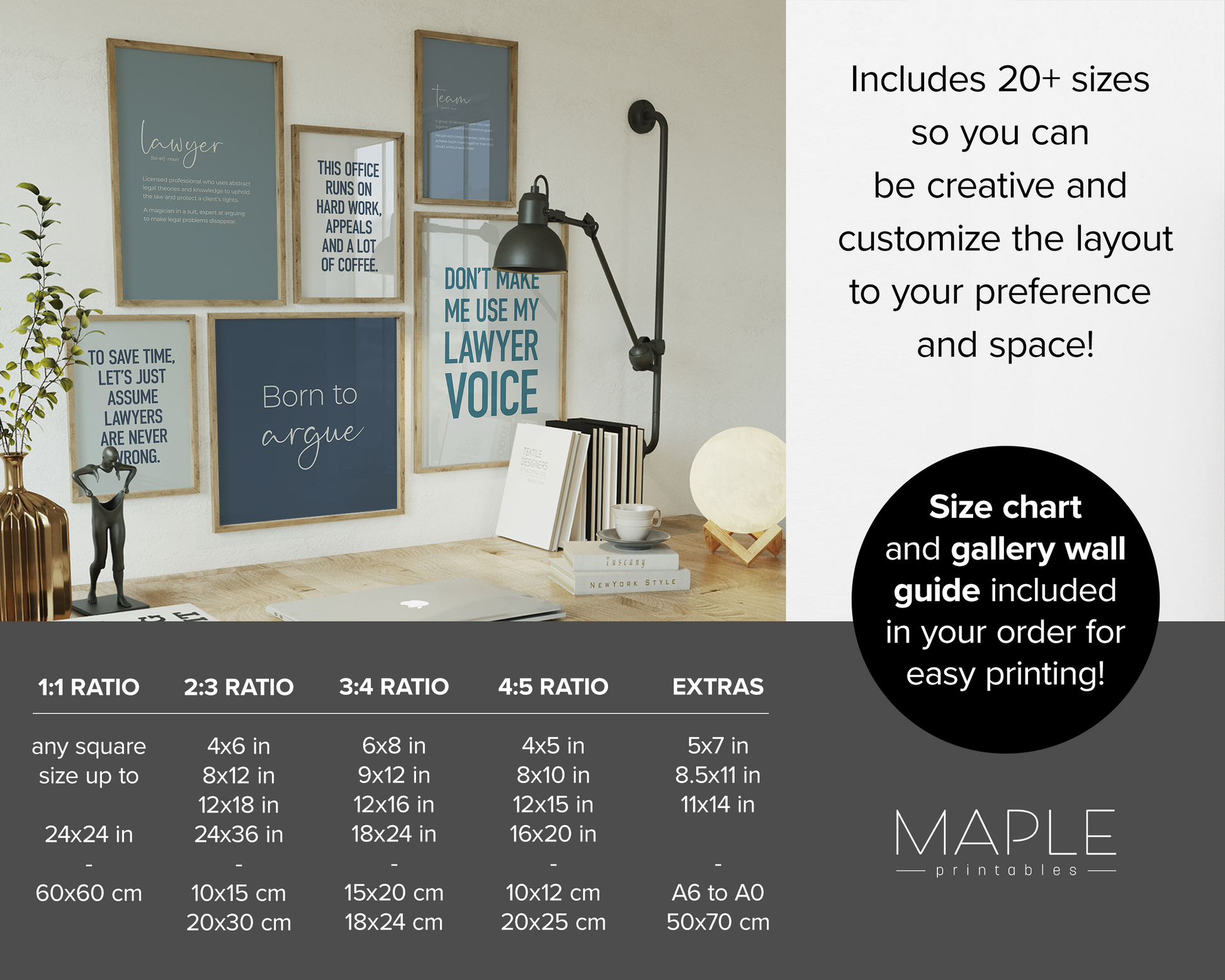 PRINTABLE SET OF 6 PRINTS - Download and print this blue lawyer gallery set to update your office decor in minutes. It features 4 funny & motivational law quotes as well as definition posters of 'lawyer' and 'team'. This would be a great gift for a lawyer or any friends & family who are studying to become lawyers - these prints would definitely add humour to their law firm office! The bundle includes 6 vertical prints, available in square format as well, so you can decorate your workplace in your own style and layout!