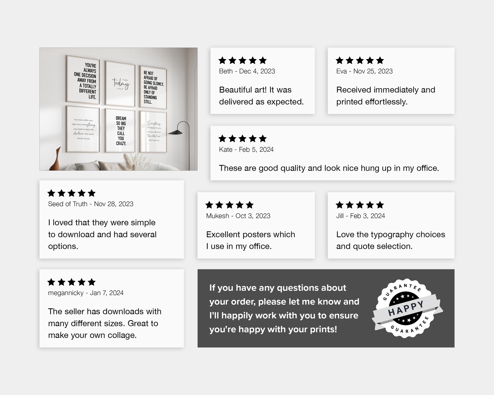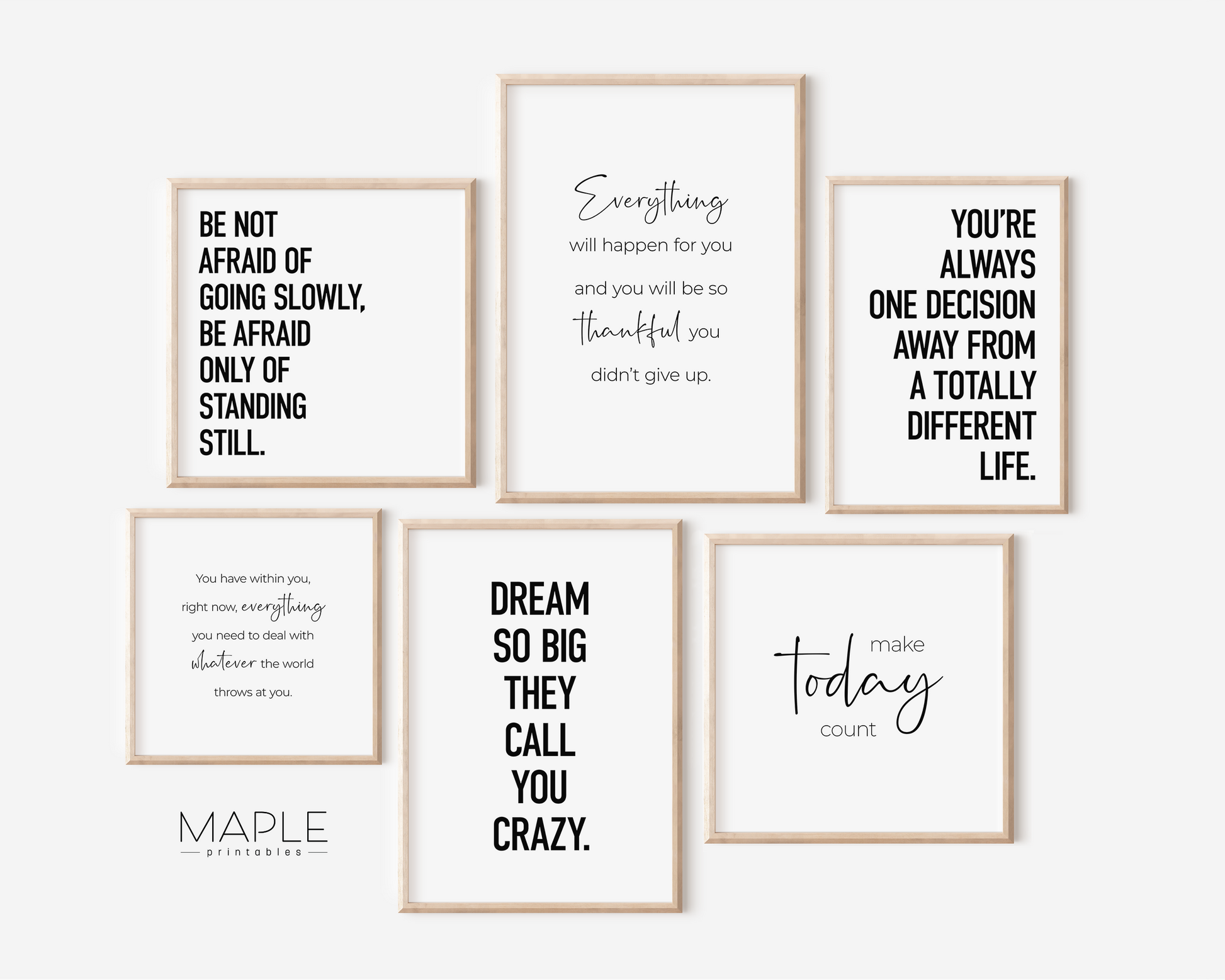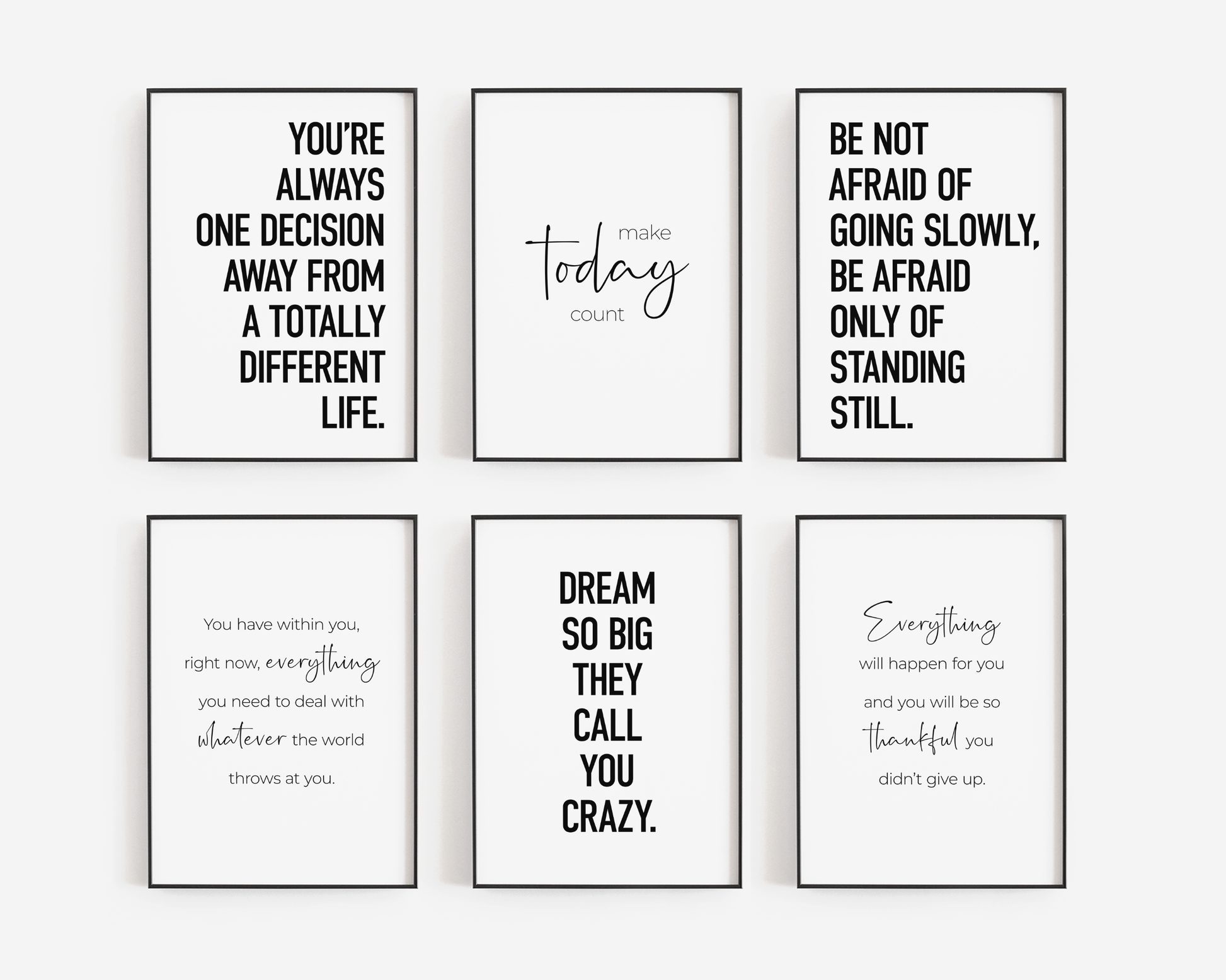 PRINTABLE SET OF 6 PRINTS - Download and print this motivational gallery set to refresh your office decor in minutes. The set of 6 inspirational quotes is a great fit for women, entrepreneurs, and anyone who would benefit from adding work motivation to their wall! It includes 6 prints in vertical and square format so you can decorate your office or break room in your own style and layout.