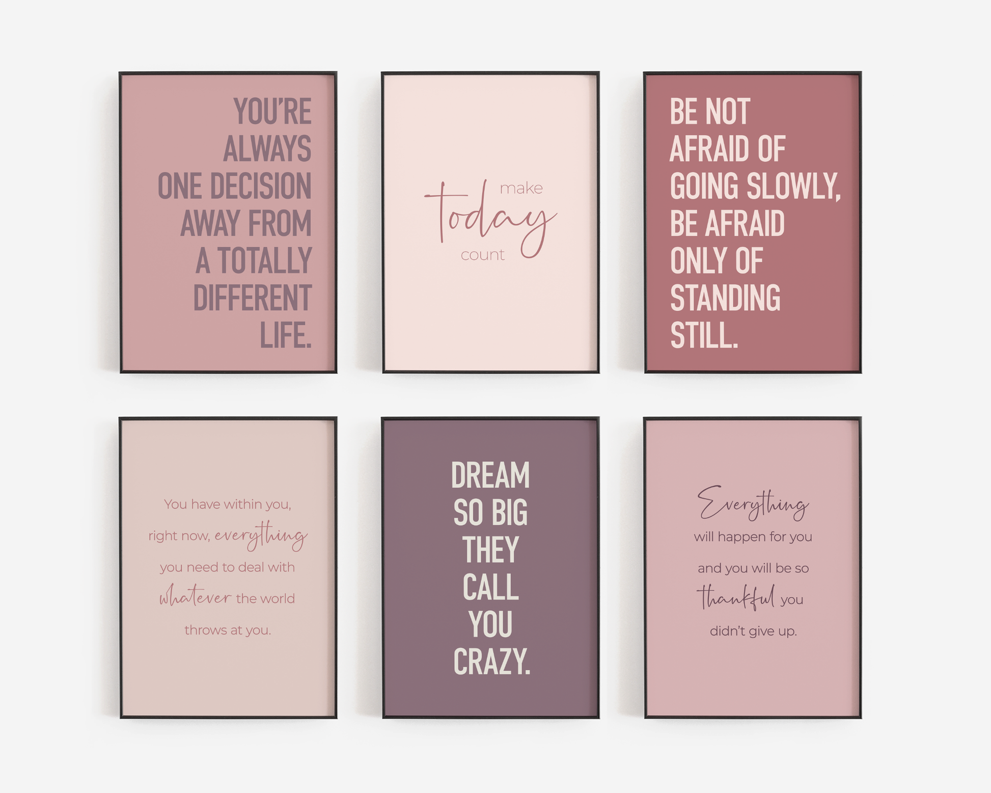 PRINTABLE SET OF 6 PRINTS - Download and print this pink & purple motivational gallery set to refresh your office decor in minutes. The set of 6 inspirational quotes is a great fit for women, entrepreneurs, and anyone who would benefit from adding work motivation to their wall! It includes 6 prints in vertical and square format so you can decorate your office or break room in your own style and layout.