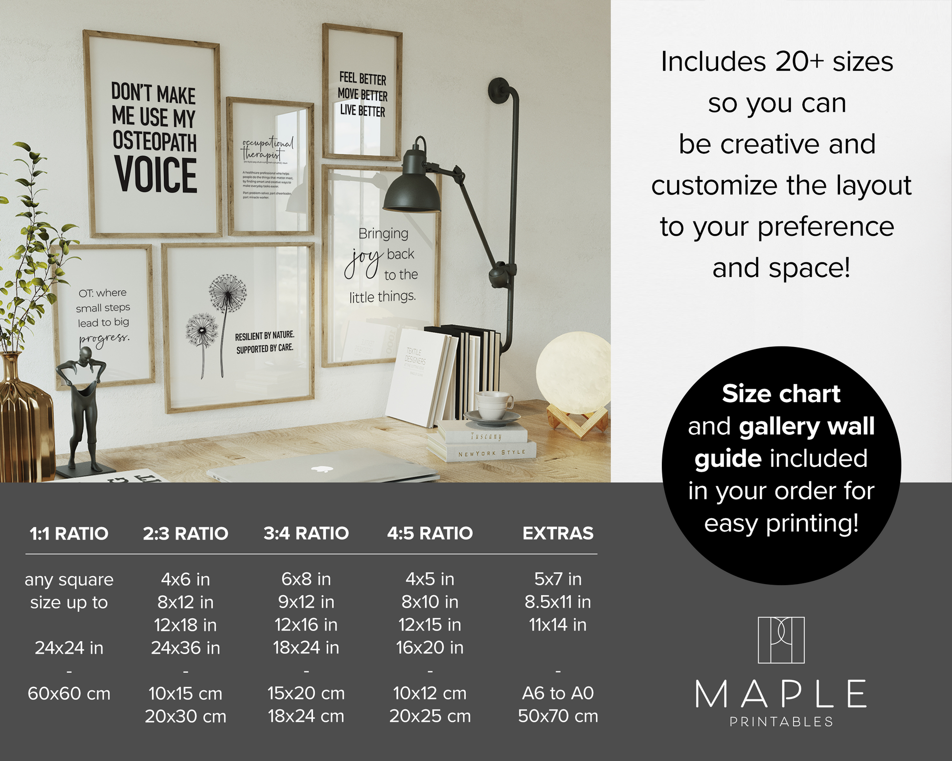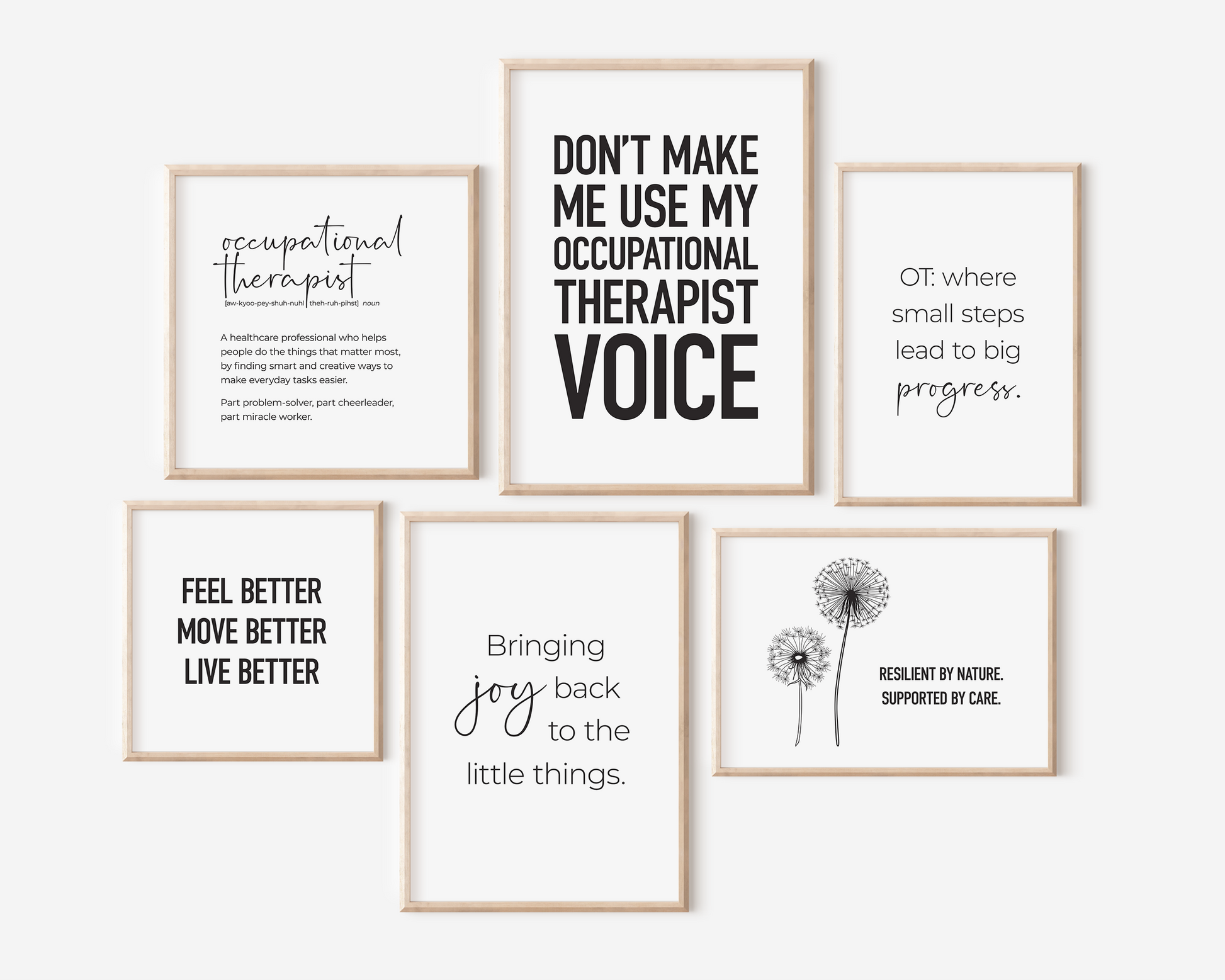 PRINTABLE SET OF 6 PRINTS - Download and print this occupational therapy gallery set to update your office decor in minutes. It features 5 motivational and funny OT quotes as well as a definition print for 'occupational therapist' and an illustration of dandelions. This would be a great gift for your OT or any friends & family who are training to become one - these prints would definitely add humour to their office! The bundle includes 5 vertical prints and 1 horizontal print, all available in square format as well, so you can decorate your workplace in your own style and layout!