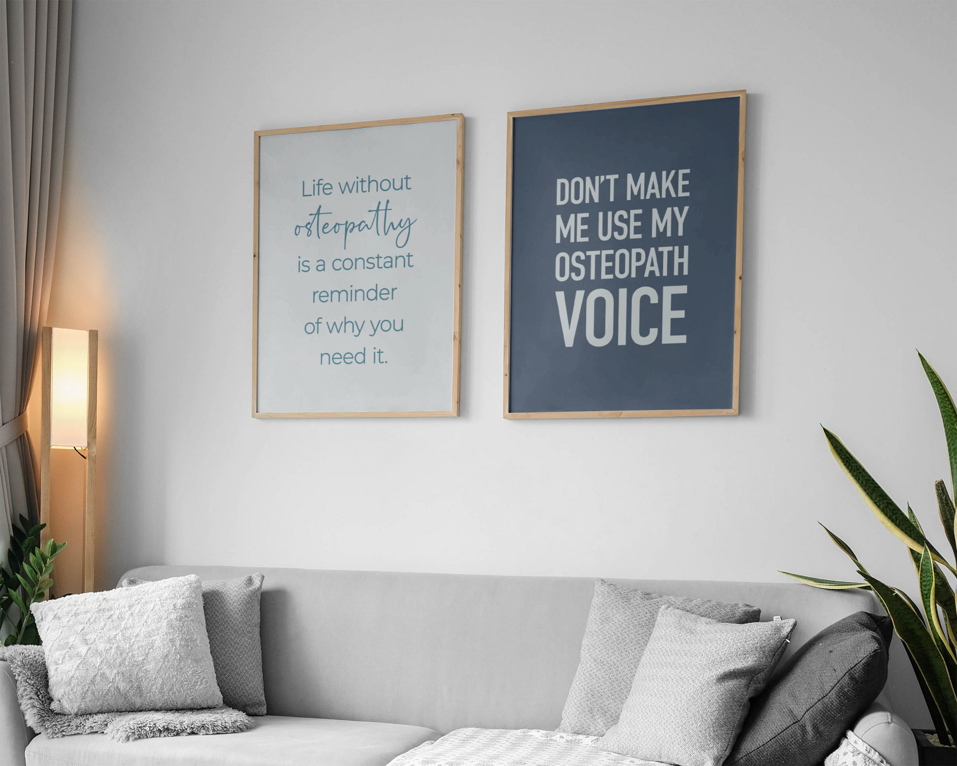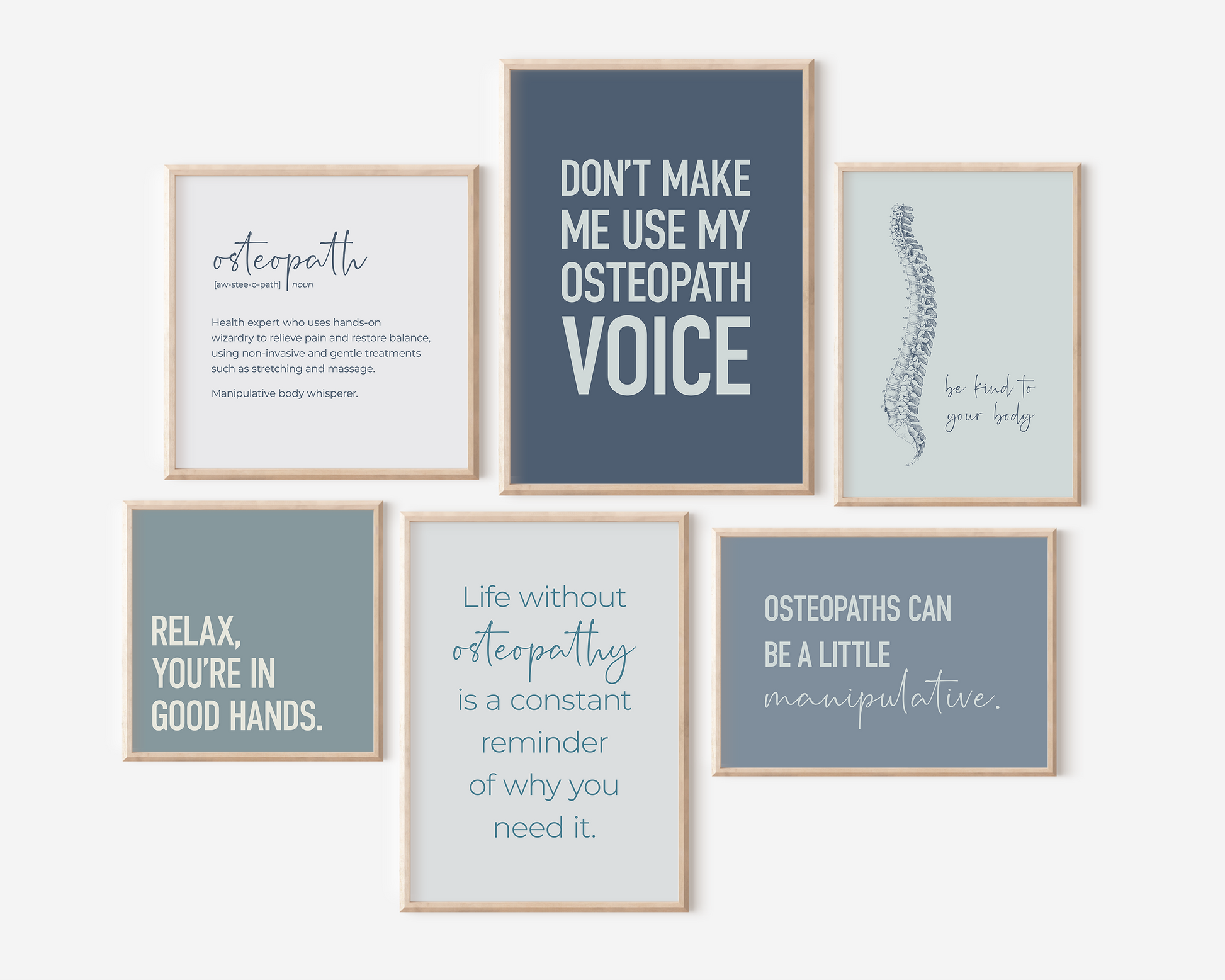 PRINTABLE SET OF 6 PRINTS - Download and print this blue osteopathy gallery set to update your office decor in minutes. It features 4 motivational and funny osteopathy quotes as well as a definition print for 'osteopath' and an illustration of a spine. This would be a great gift for your osteo or any friends & family who are training to become osteopaths - these prints would definitely add humour to their office! The bundle includes 5 vertical prints and 1 horizontal print, all available in square format as well, so you can decorate your workplace in your own style and layout!