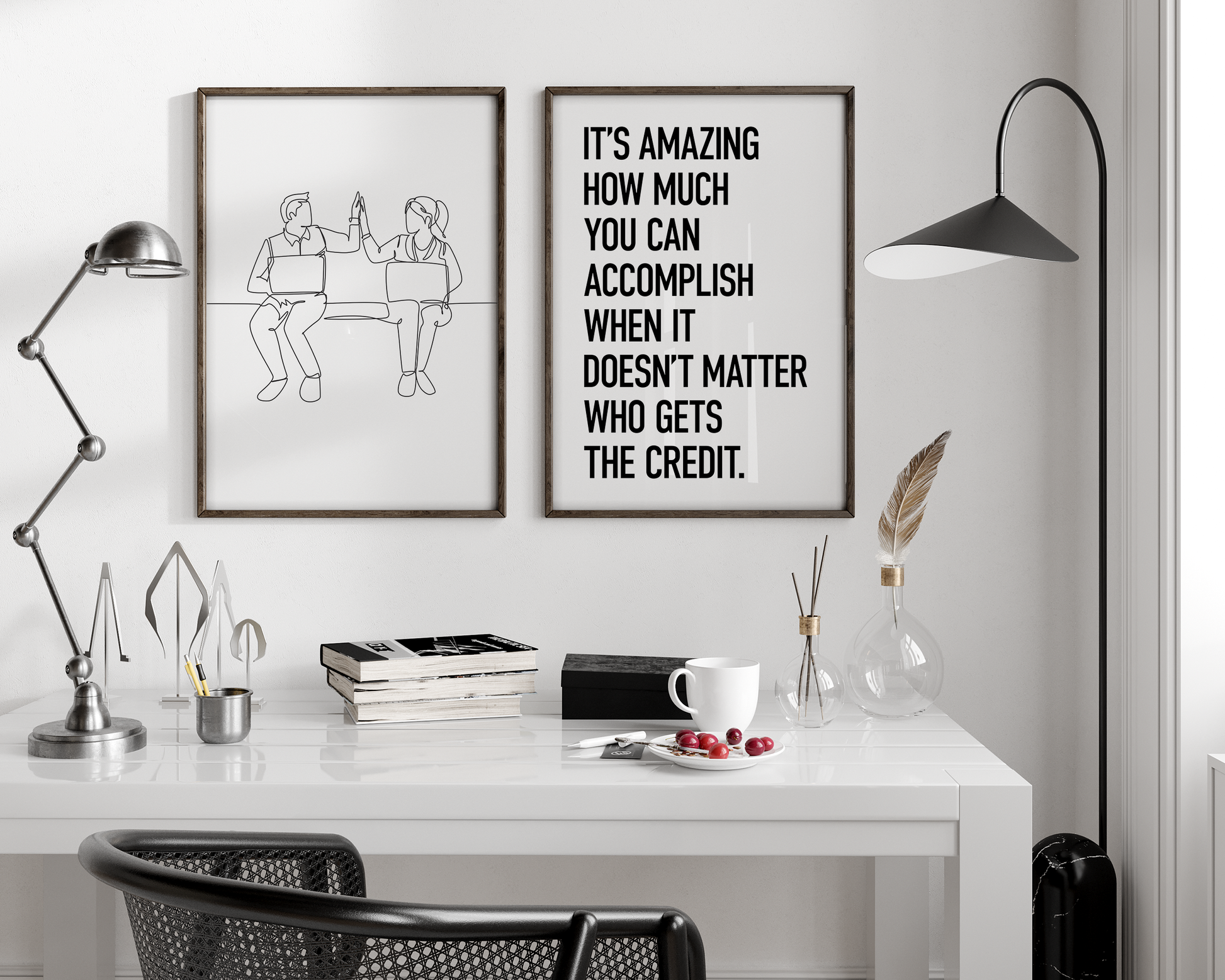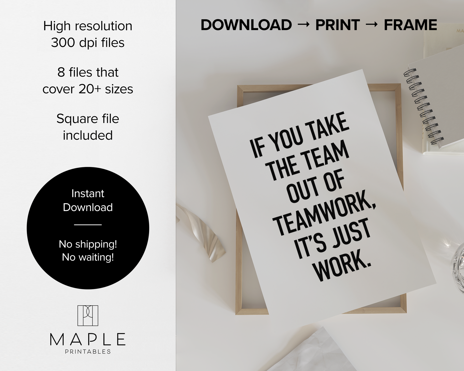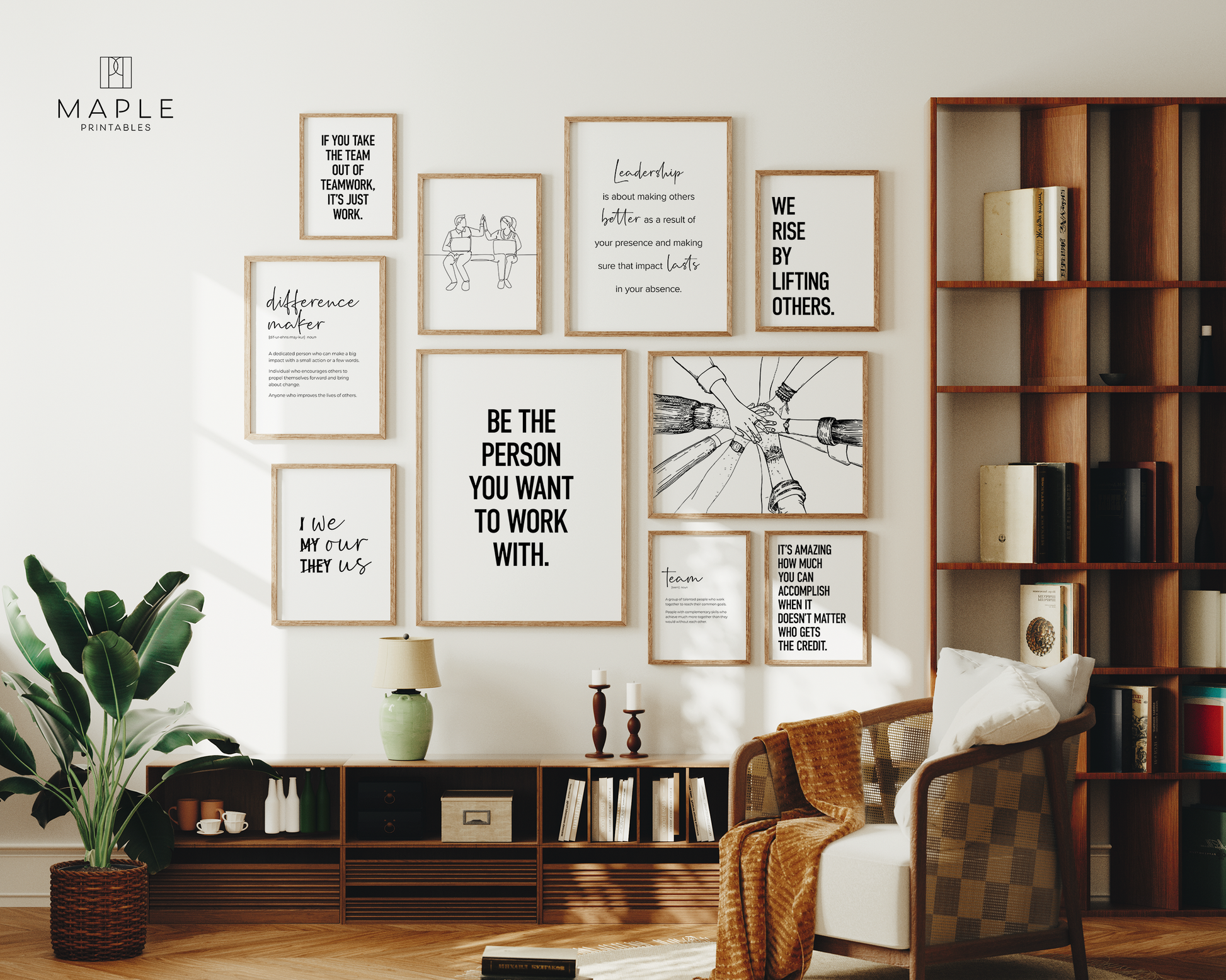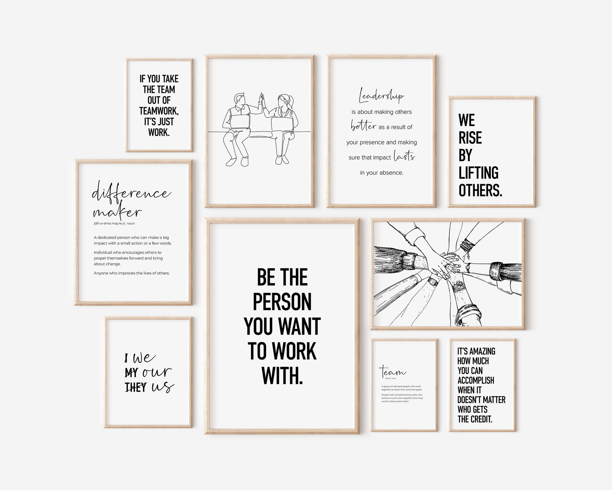 PRINTABLE SET OF 10 PRINTS - Download and print this teamwork gallery set to update your office decor in minutes. This office wall art bundle includes 10 printables, including 6 motivational quotes, 2 definition posters (difference maker and team), a drawing of hands stacked, and line art of two coworkers doing a high five. This would be a great addition to your workplace or office decor as a reminder to rely on your team and have a teamwork mindset. The set includes 9 vertical prints and 1 horizontal print, all available in square format as well so you can decorate your workspace in your own style and layout!