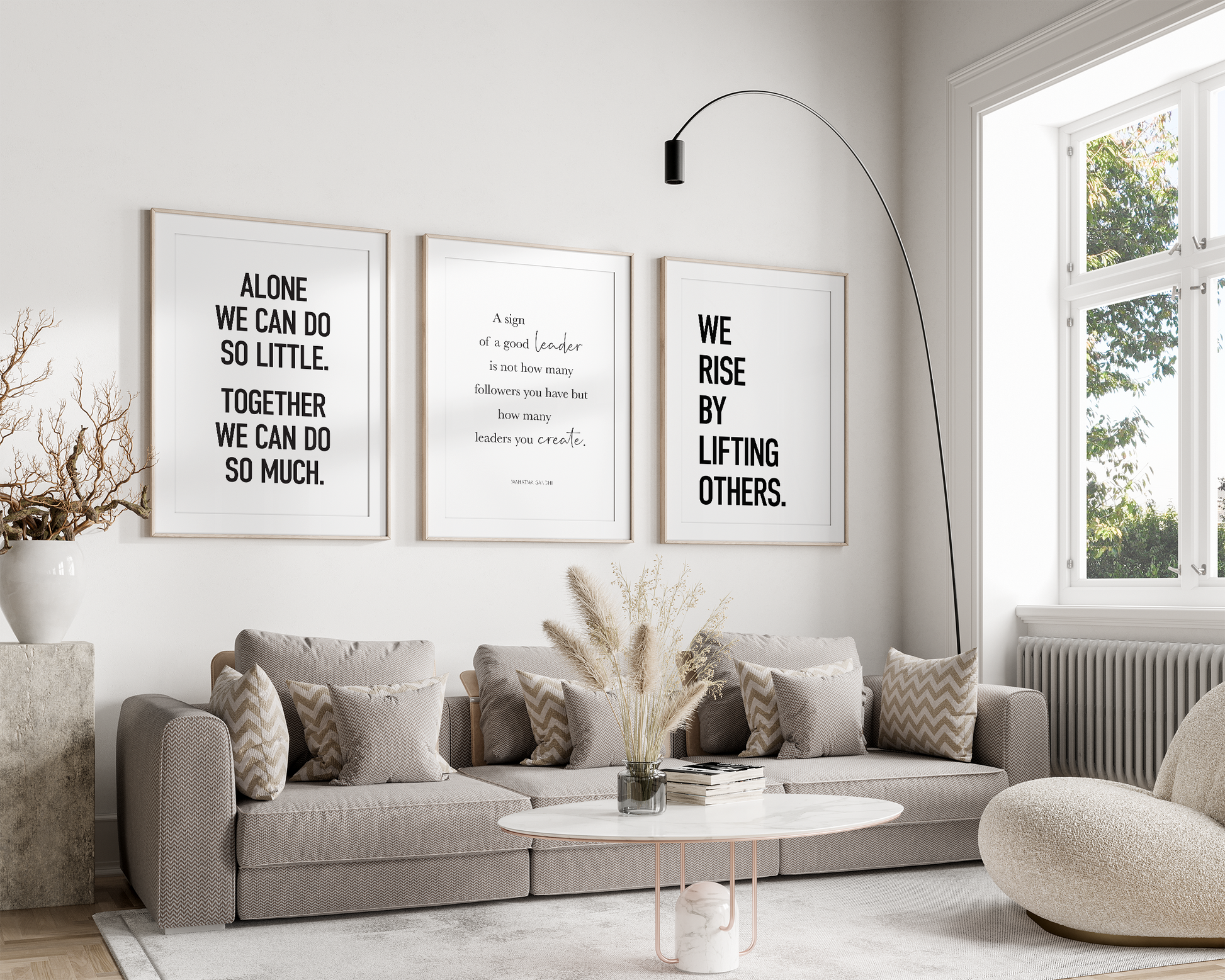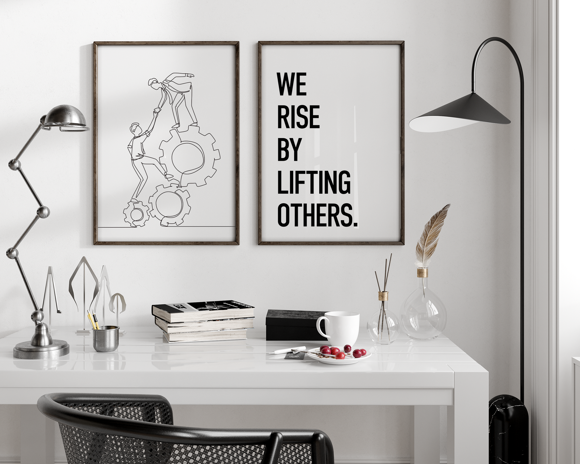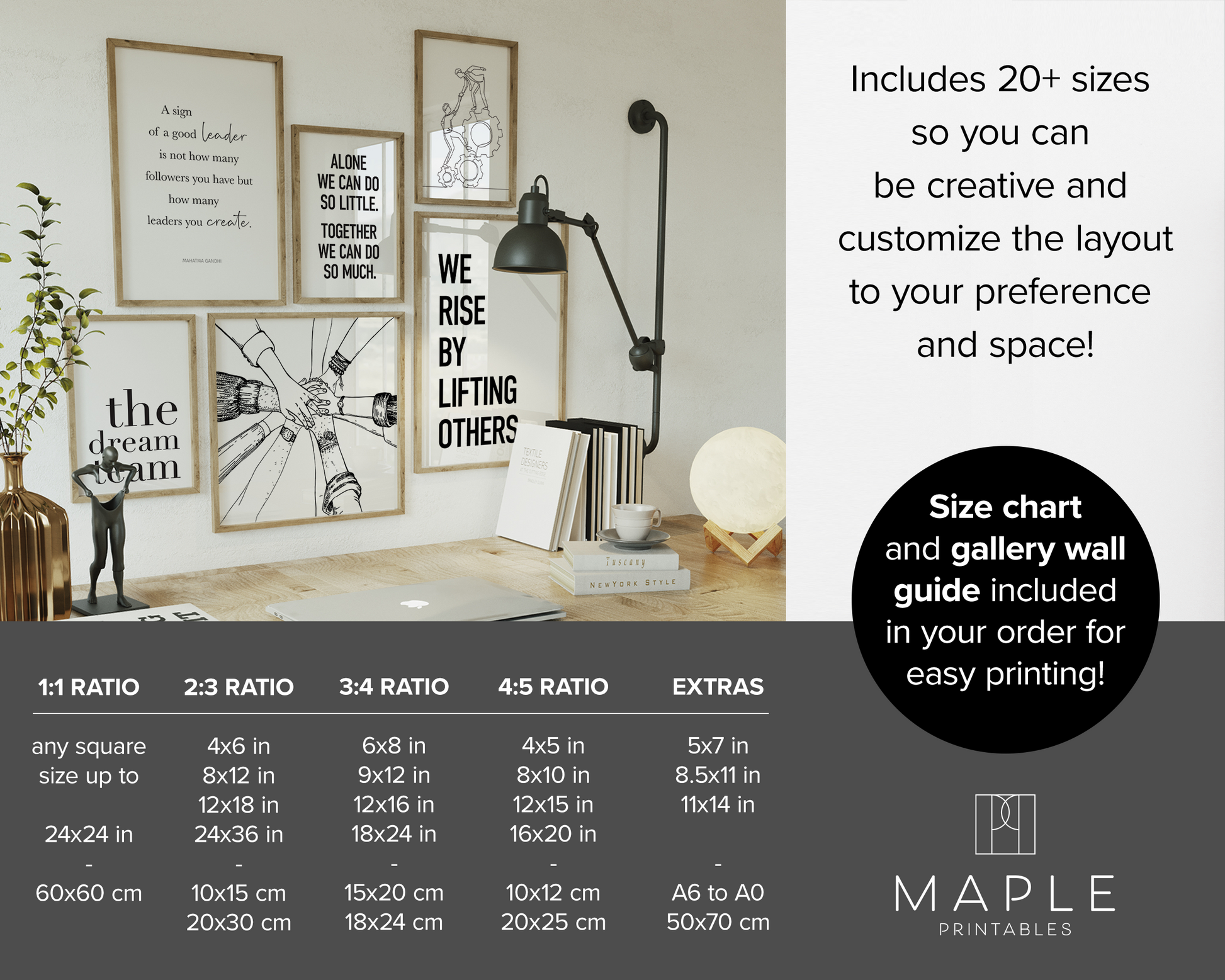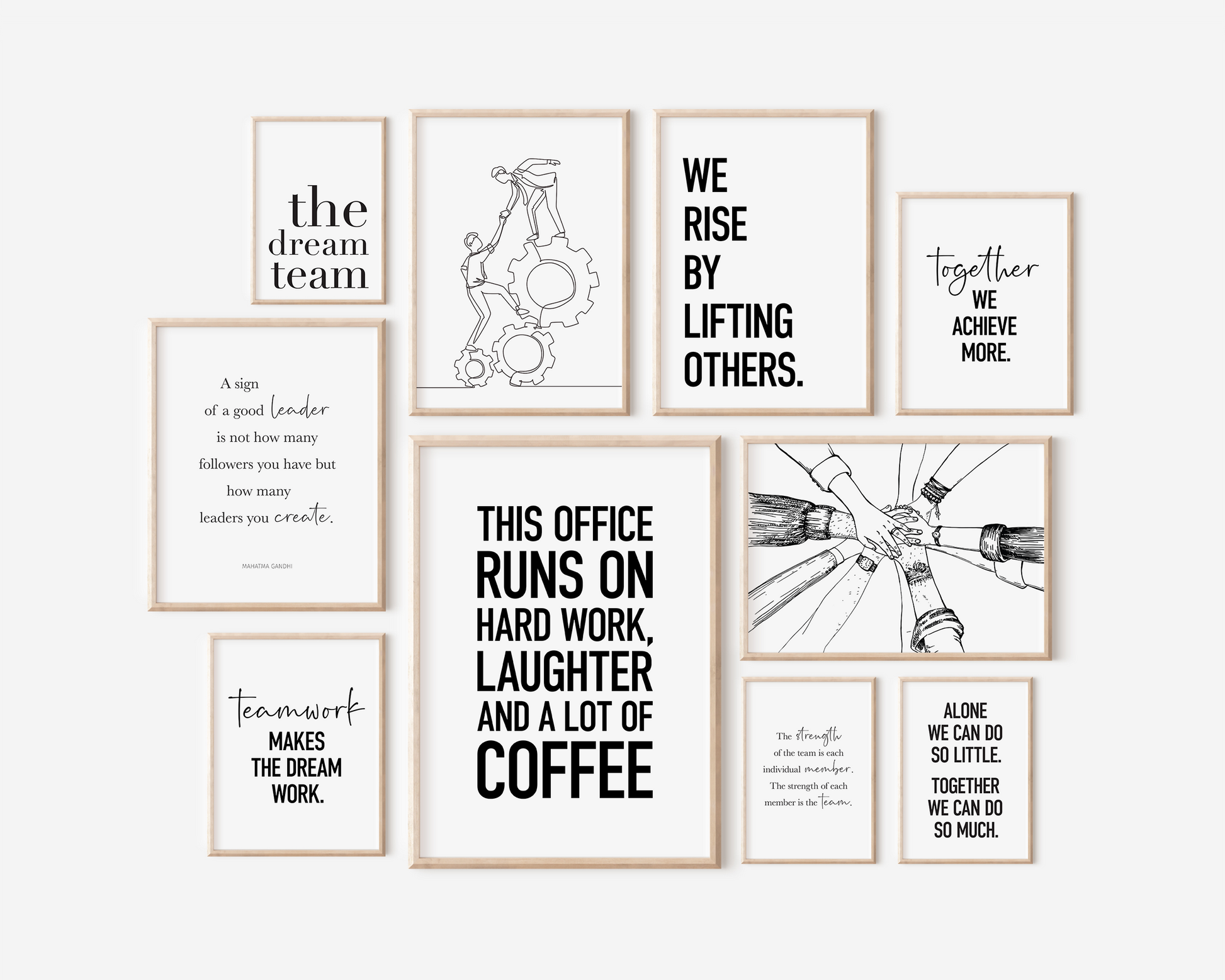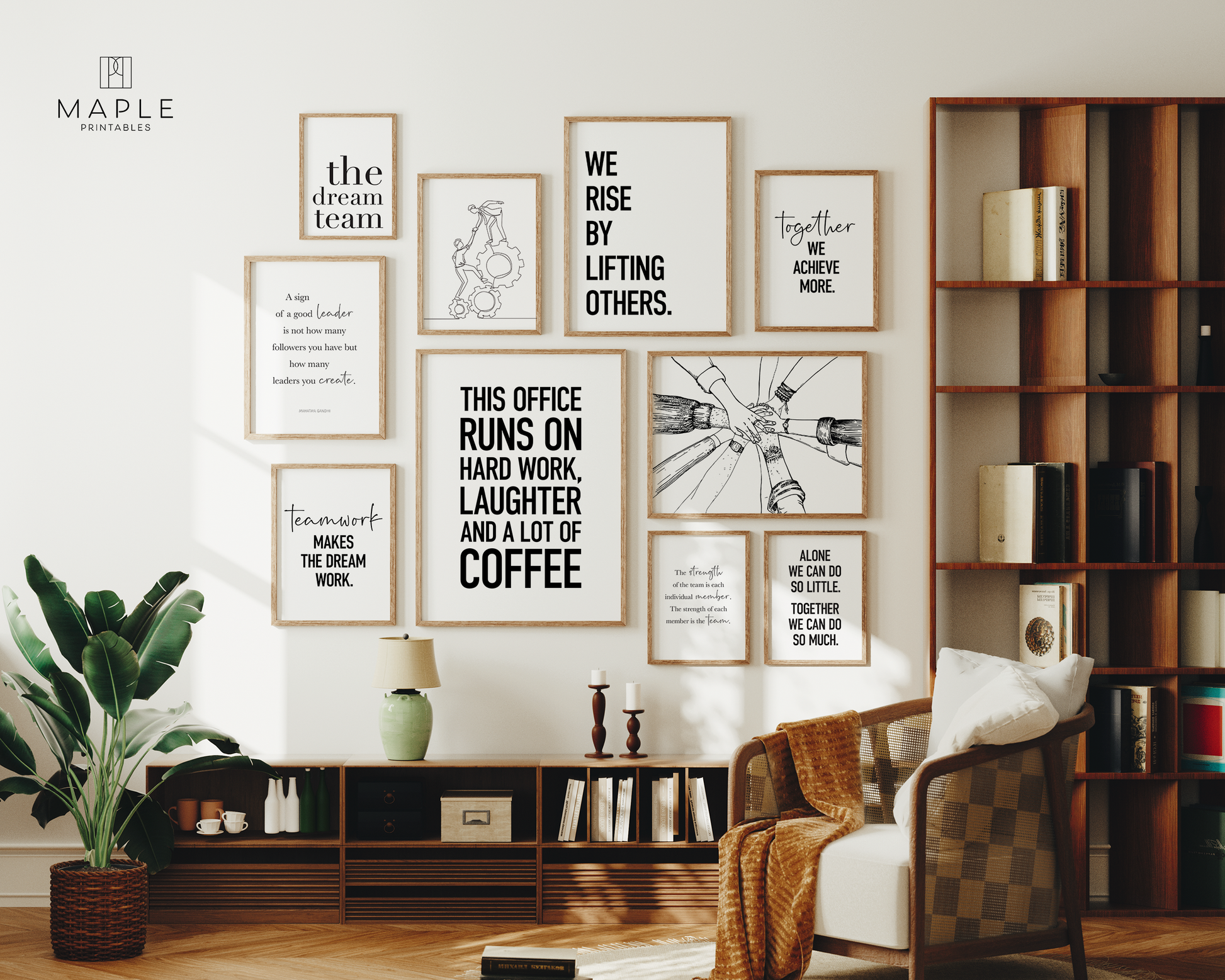 PRINTABLE SET OF 10 PRINTS - Download and print this teamwork gallery set to update your office decor in minutes. This office wall art bundle includes 10 printables, including 6 motivational quotes, 2 definition posters (difference maker and team), a drawing of hands stacked, and line art of two coworkers doing a high five. This would be a great addition to your workplace or office decor as a reminder to rely on your team and have a teamwork mindset. The set includes 9 vertical prints and 1 horizontal print, all available in square format as well so you can decorate your workspace in your own style and layout!