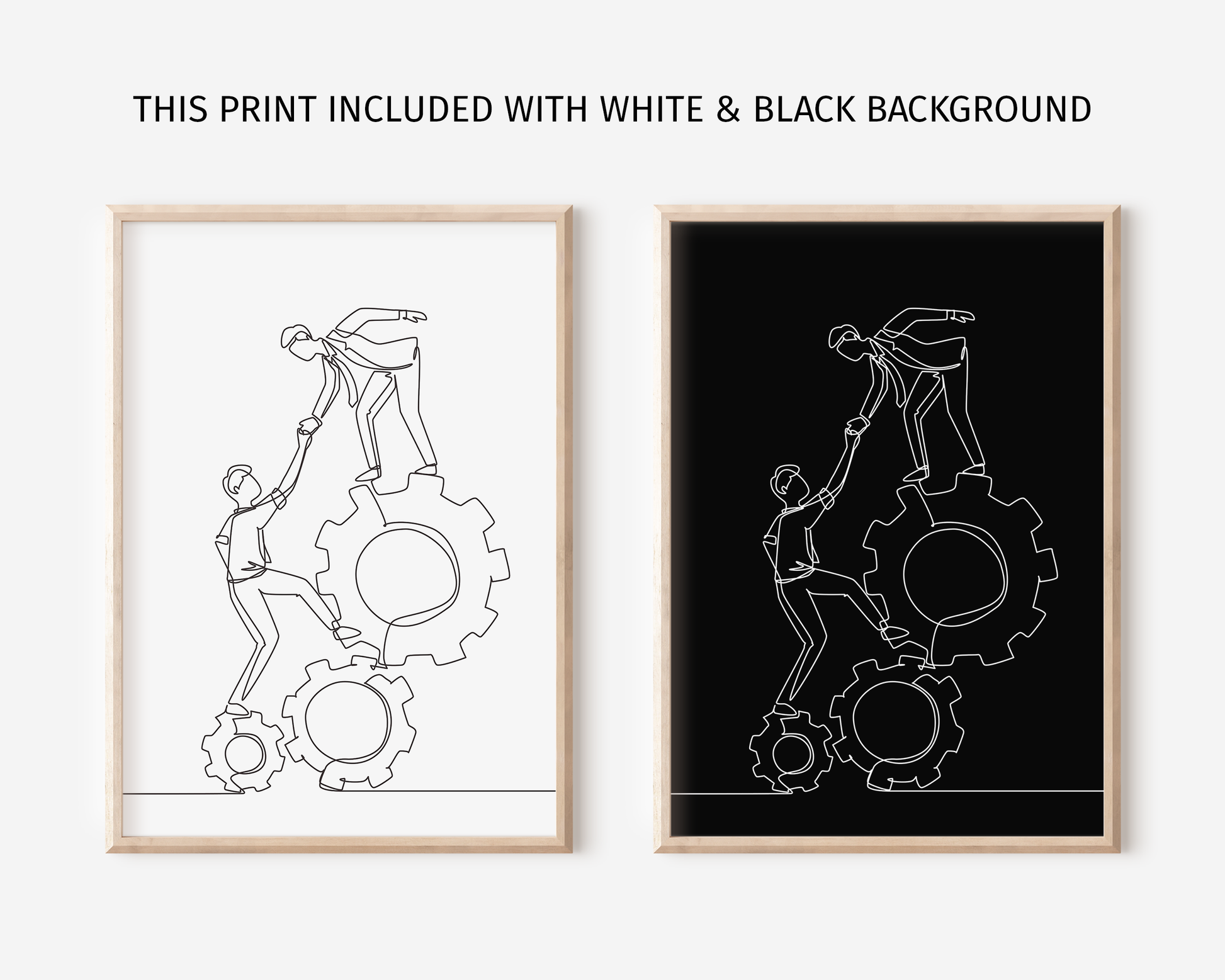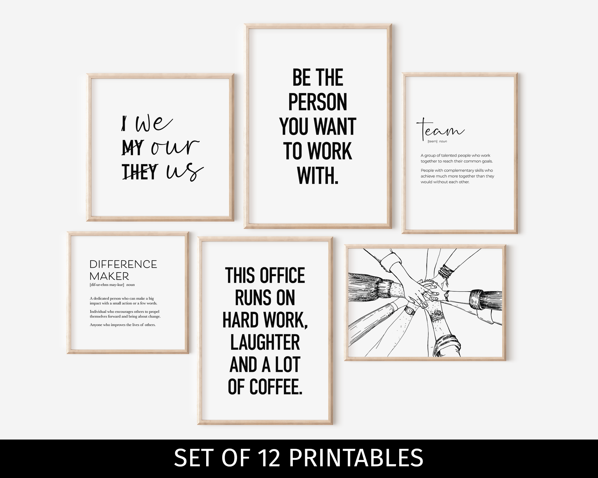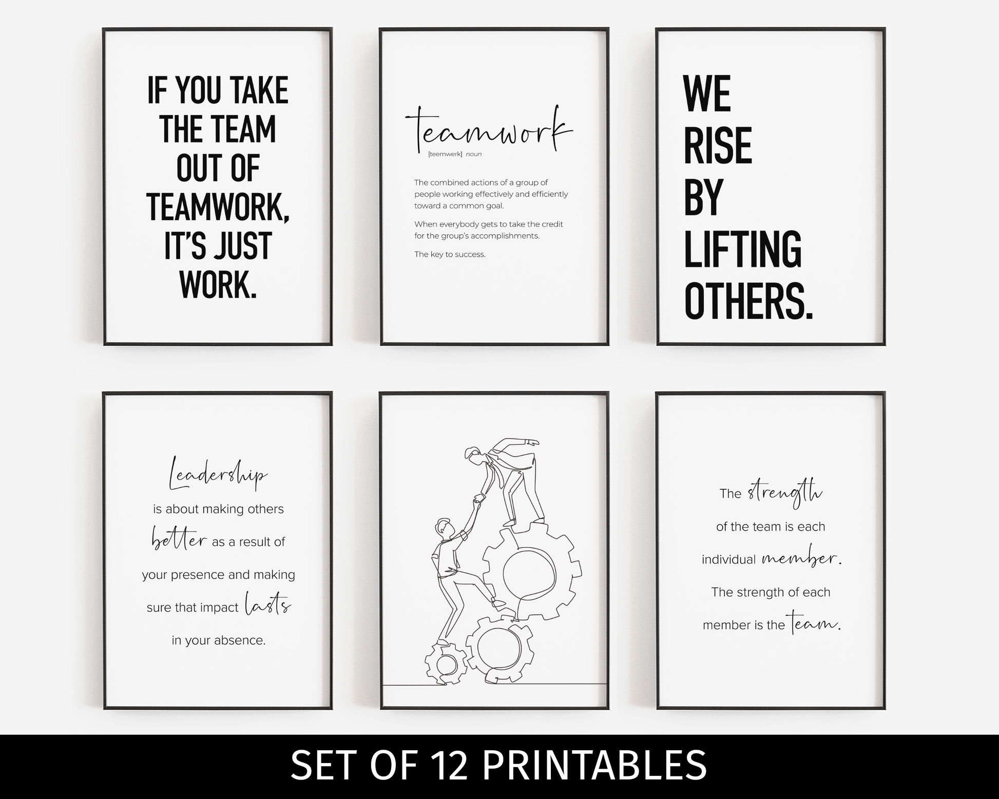PRINTABLE SET OF 12 PRINTS - Download and print this teamwork gallery set to update your office decor in minutes. The office wall art bundle includes 12 printables, including 7 motivational quotes, 3 definition posters, and 2 illustrations of hands stacked and team members working together. It would be a great addition to your home office or desk decor as a reminder to rely on your team and teamwork. The set includes 11 vertical prints and 1 horizontal print, all available in square format as well - make it yours to decorate your workplace in your own style and layout!