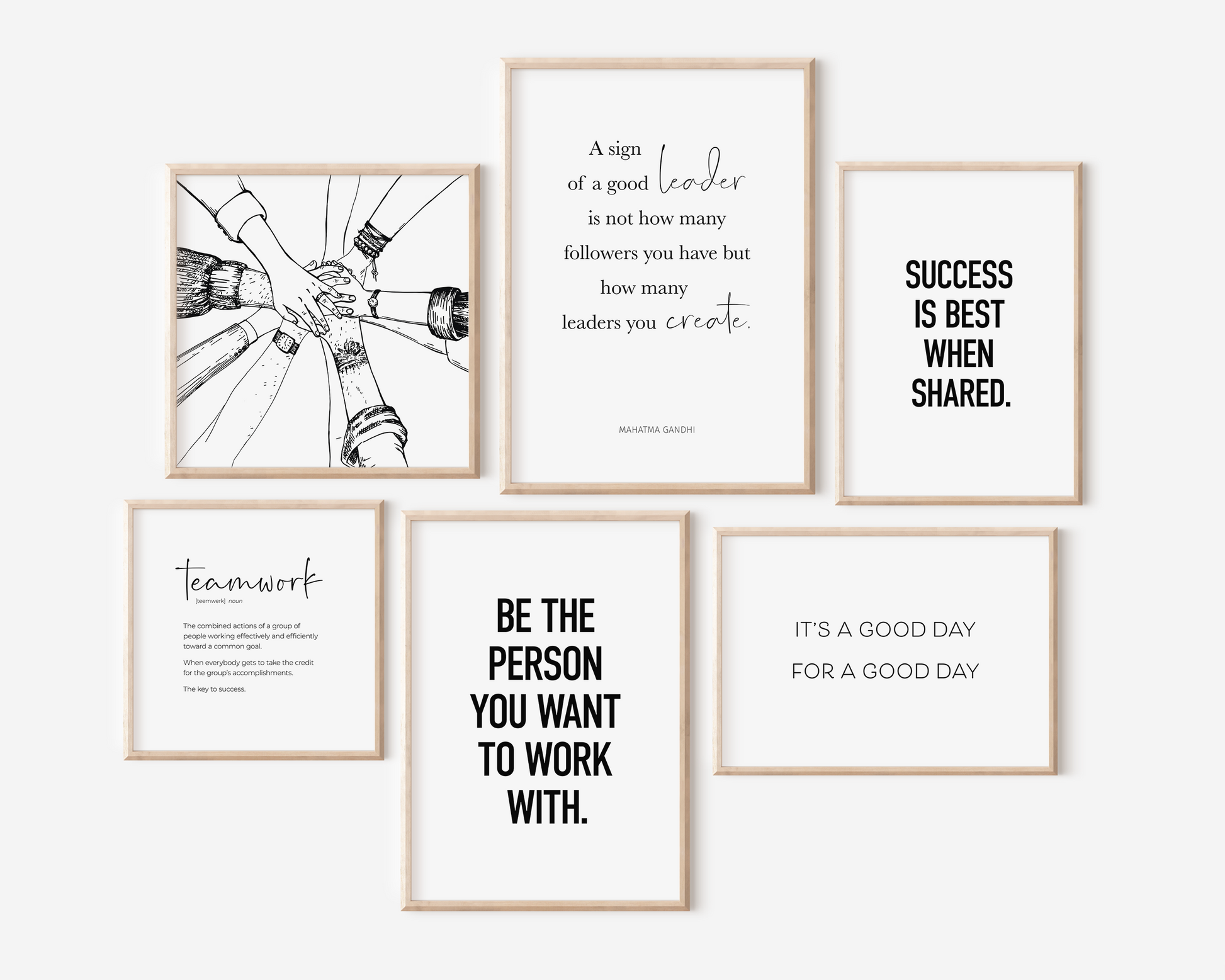 PRINTABLE SET OF 6 PRINTS - Download and print this teamwork gallery set to update your office decor in minutes. The office wall art bundle includes 6 printables, including 4 motivational quotes, a 'teamwork' definition poster and a drawing of hands stacked. It would be a great addition to your home office or desk decor as a reminder to rely on your team and teamwork. The set includes 4 vertical prints and 2 horizontal prints, all available in square format as well - make it yours to decorate your workplace in your own style and layout!
