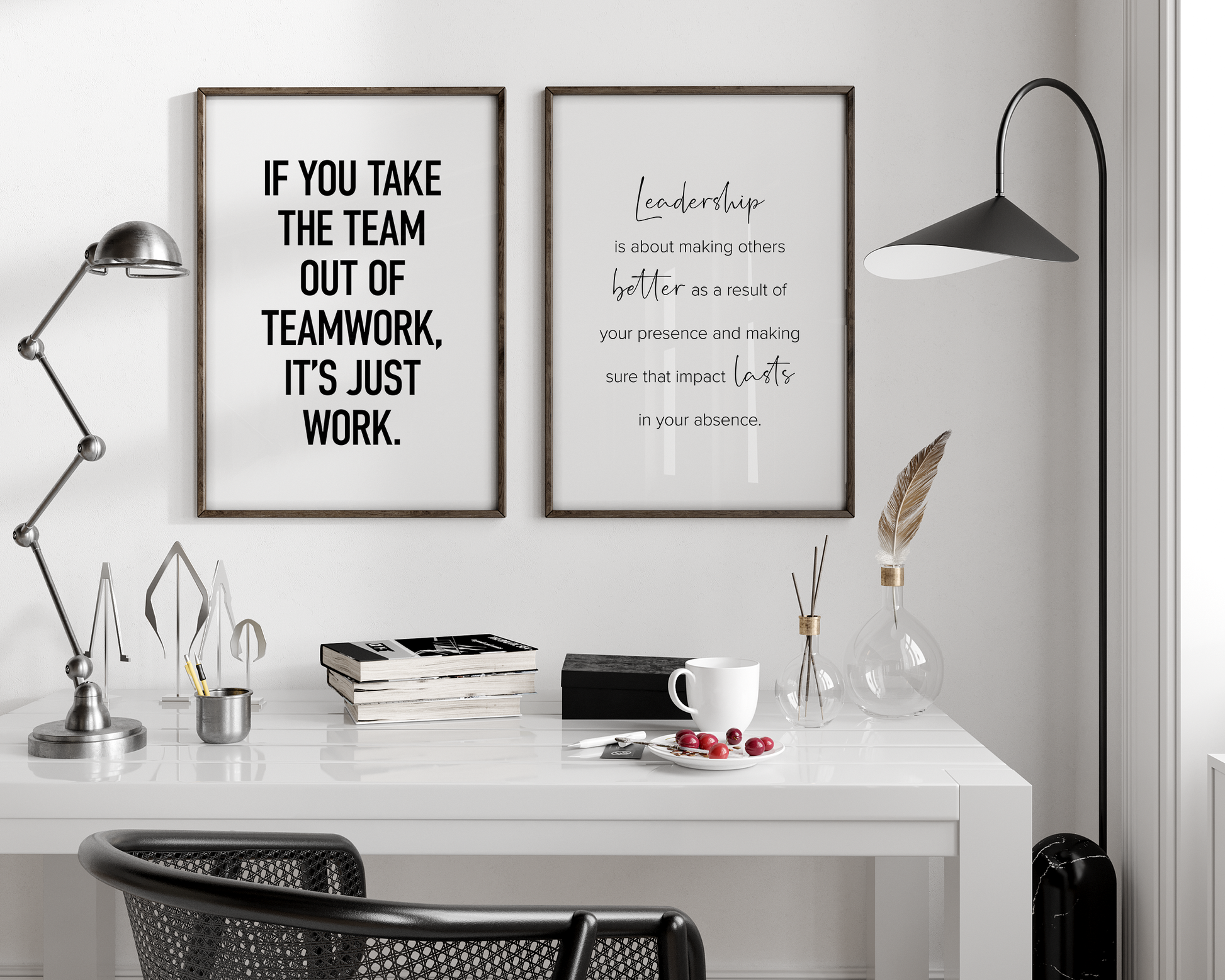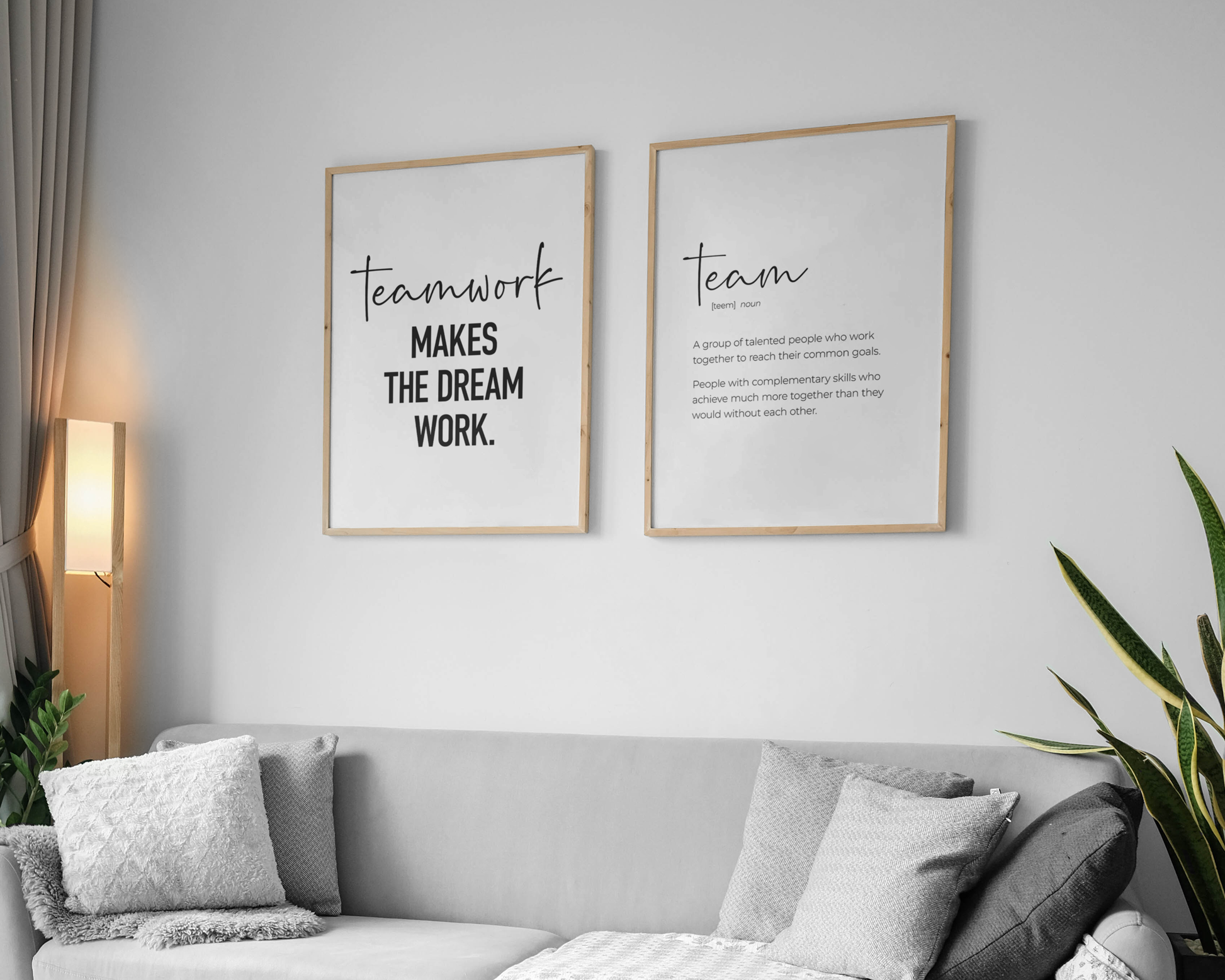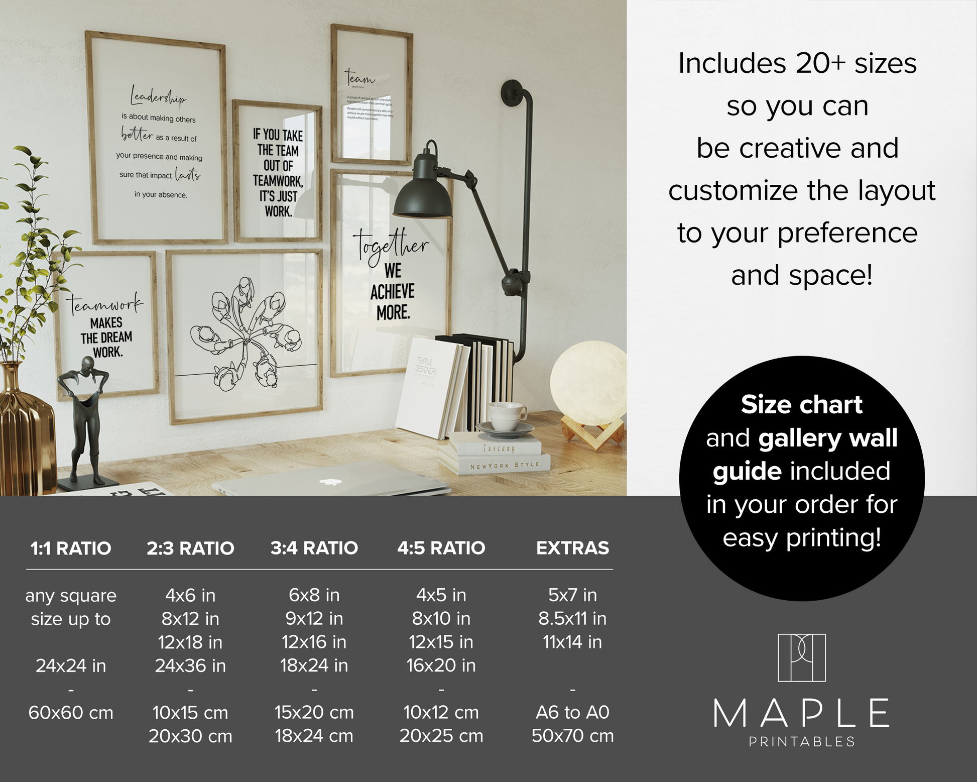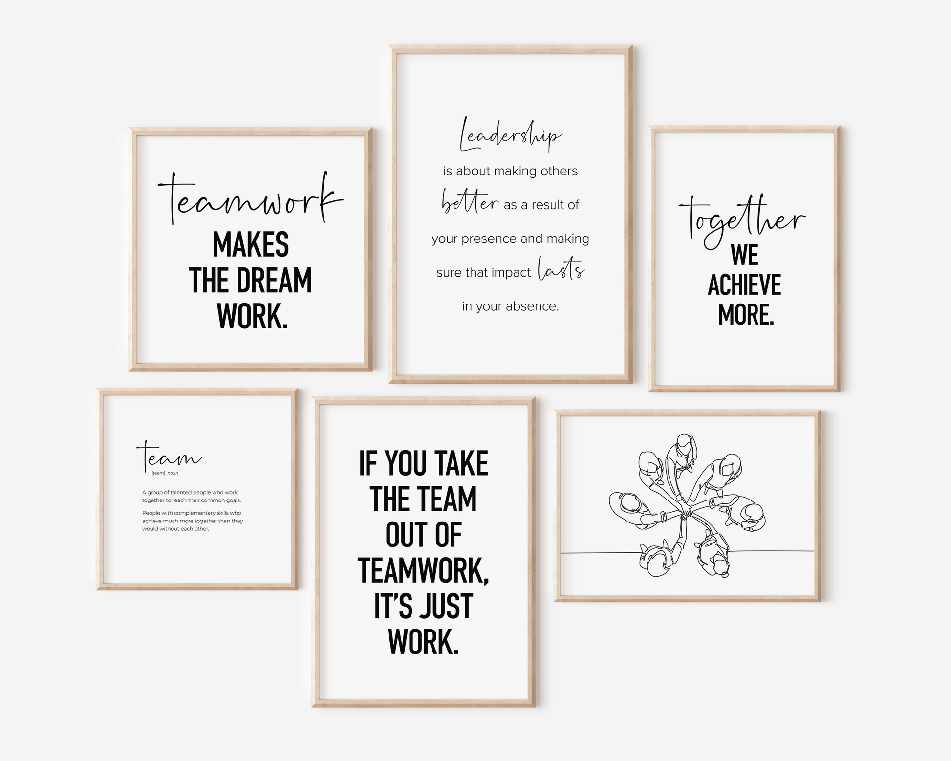 PRINTABLE SET OF 6 PRINTS - Download and print this teamwork gallery set to update your office decor in minutes. The office wall art bundle includes 6 printables, including 4 motivational quotes, a 'team' definition poster and a drawing of people with hands stacked. It would be a great addition to your home office or desk decor as a reminder to rely on your team and teamwork. The set includes 5 vertical prints and 1 horizontal print, all available in square format as well - make it yours to decorate your workplace in your own style and layout!