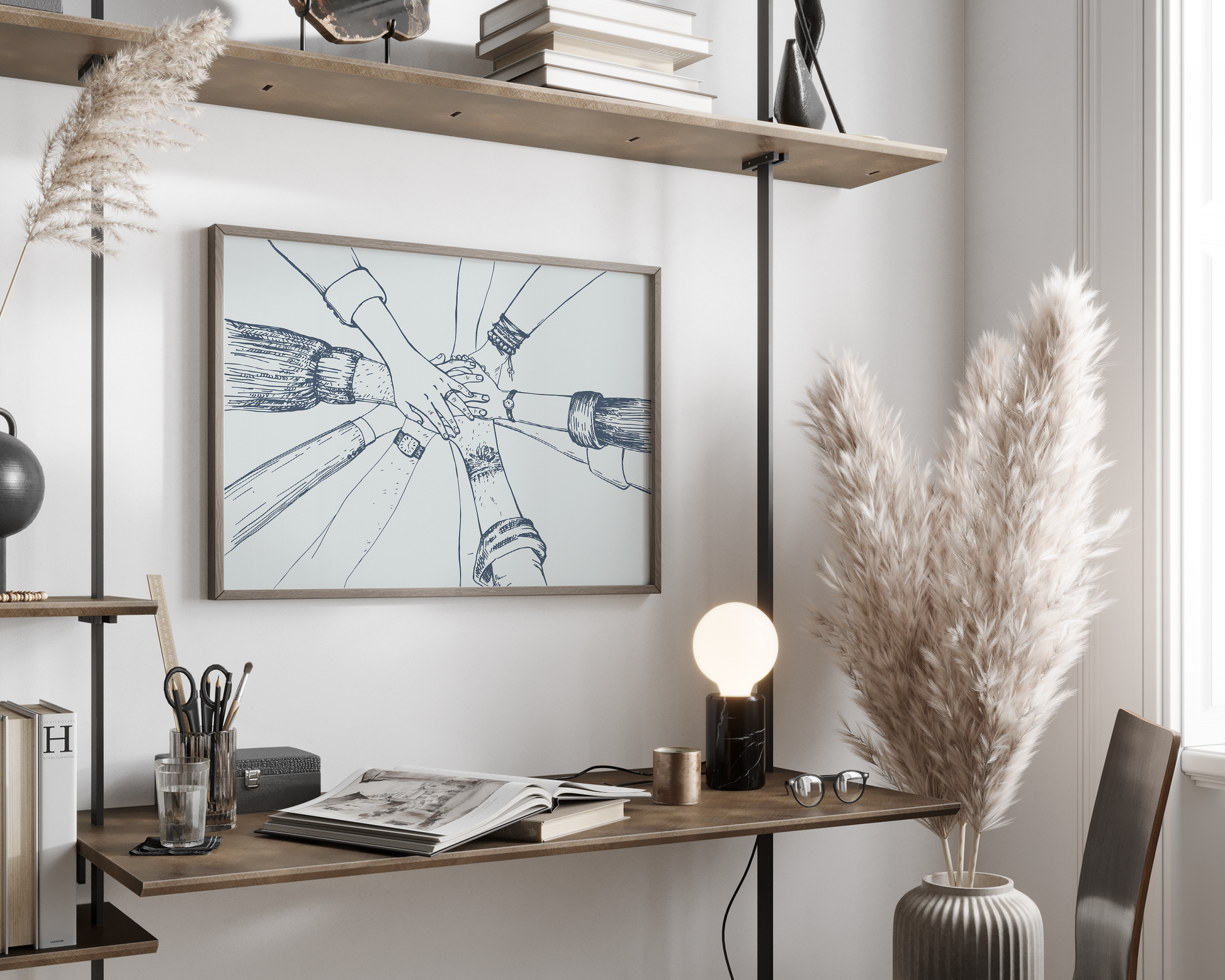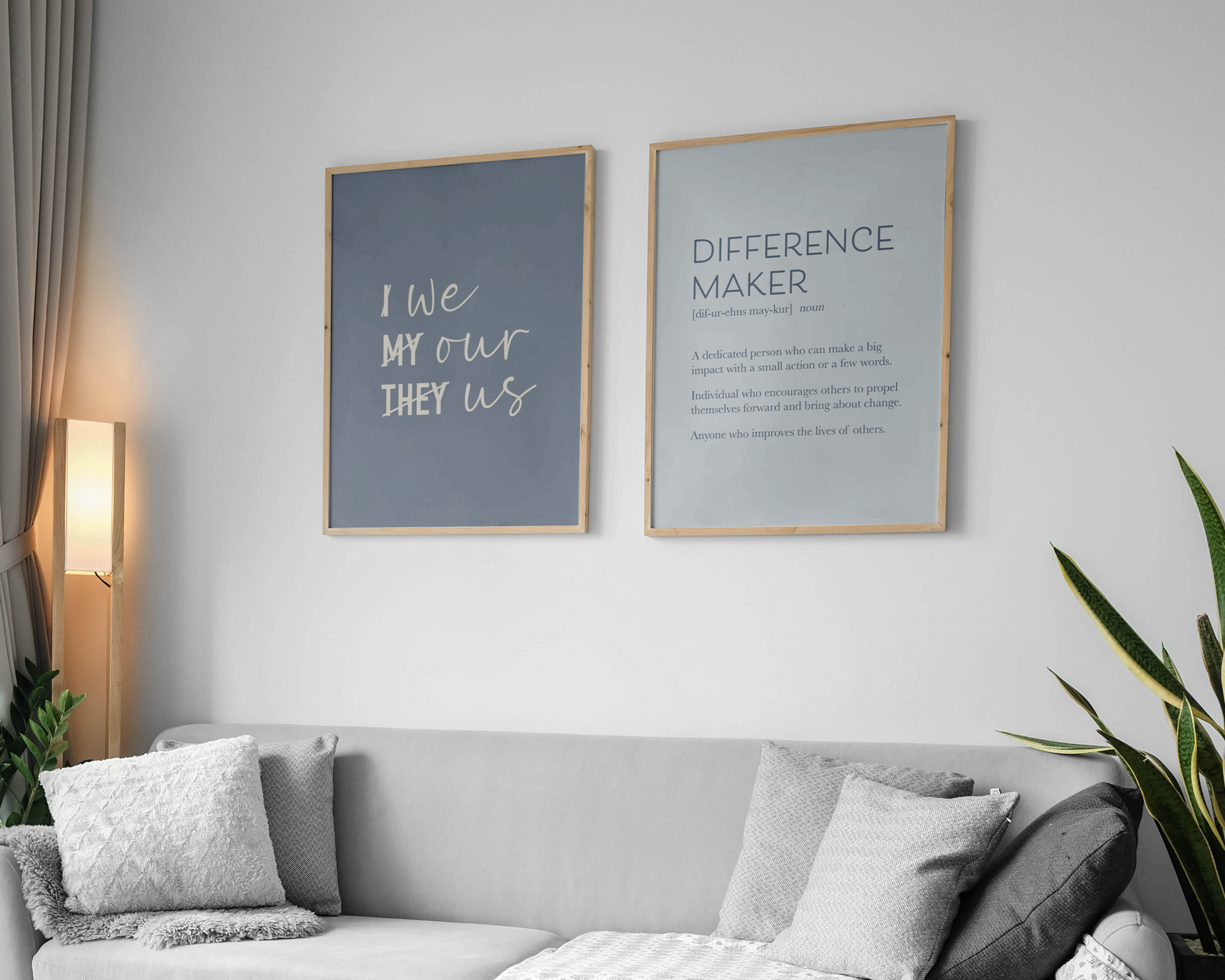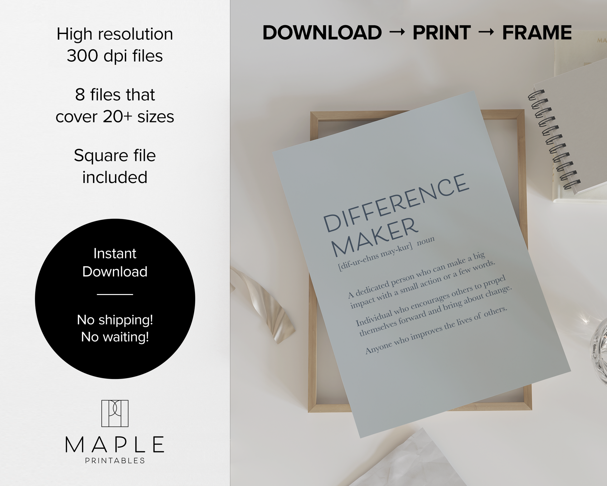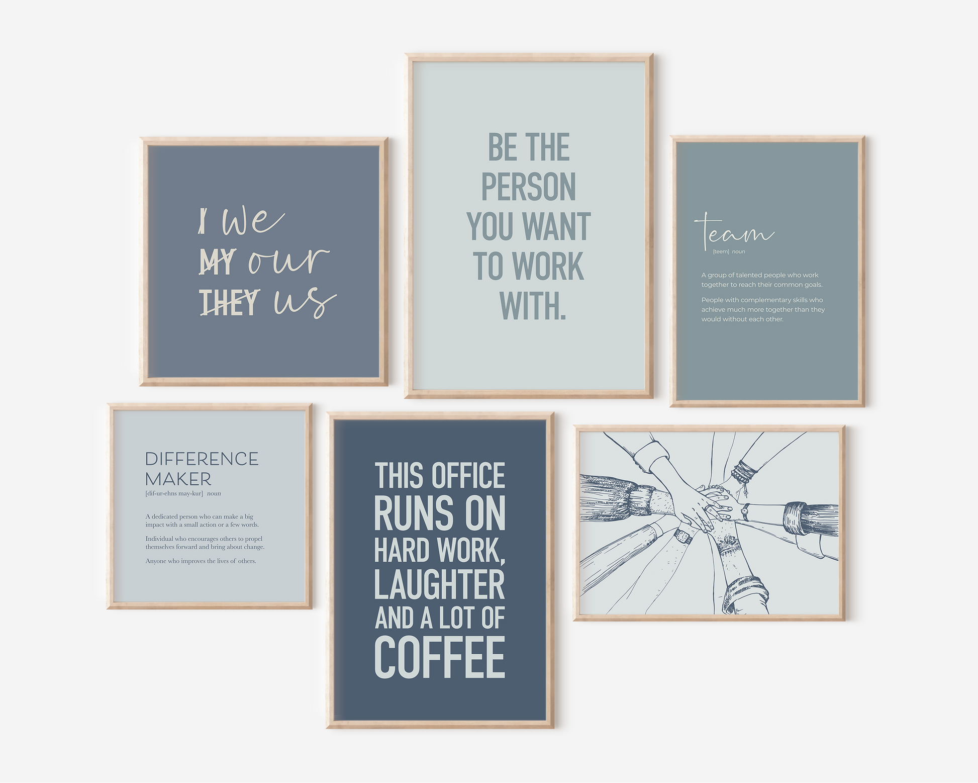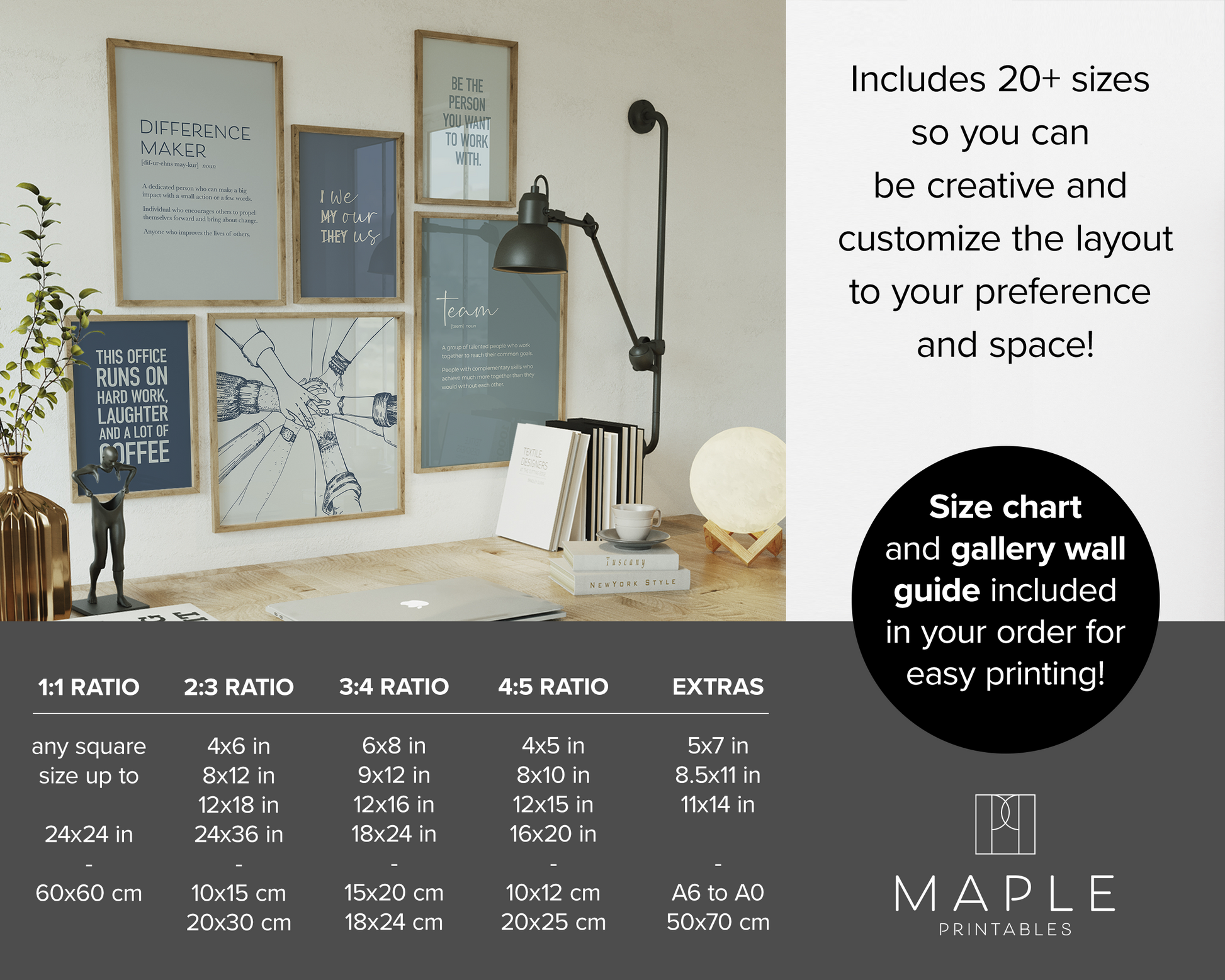 PRINTABLE SET OF 6 PRINTS - Download and print this teamwork gallery set to update your office decor in minutes. The office wall art bundle includes 6 printables in shades of blue, including 3 motivational quotes, 2 definition posters of 'team' & 'difference maker', and a drawing of hands stacked. It would be a great addition to your home office or desk decor as a reminder to rely on your team and teamwork. The set includes 5 vertical prints and 1 horizontal print, all available in square format as well - make it yours to decorate your workplace in your own style and layout!