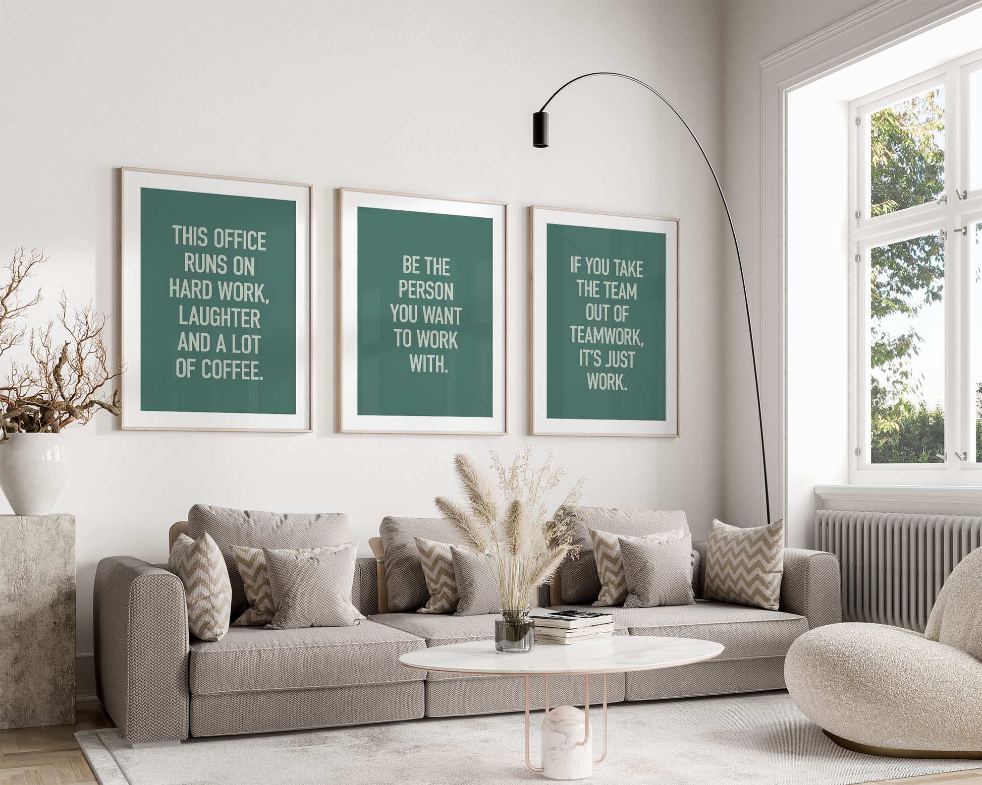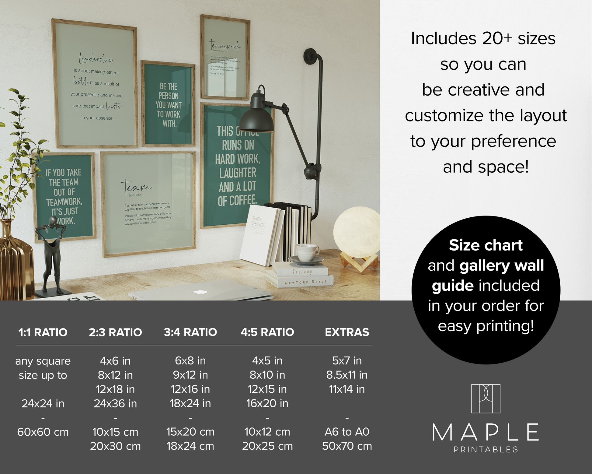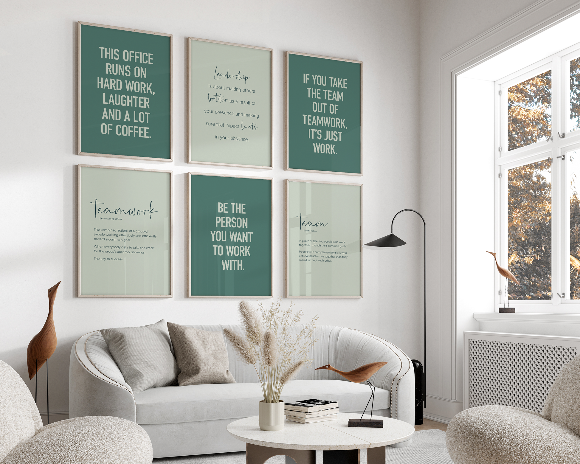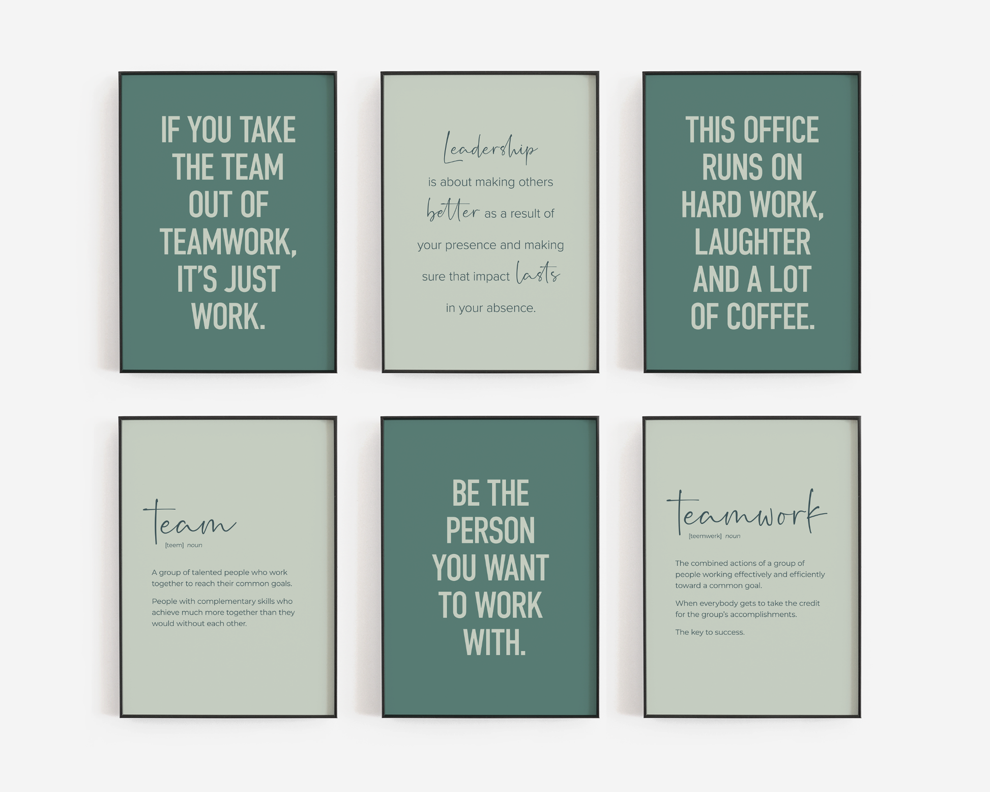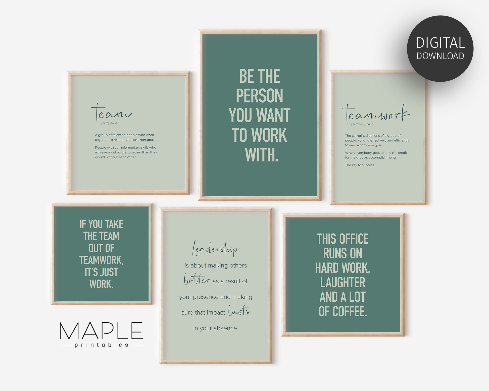 PRINTABLE SET OF 6 PRINTS - Download and print this teamwork gallery set to update your office decor in minutes. The office wall art bundle includes 6 motivational printables in shades of green, in both vertical and square format so you can decorate your office or break room in your own style and layout. It would be a great gift idea for your staff to use as office or cubicle decor!