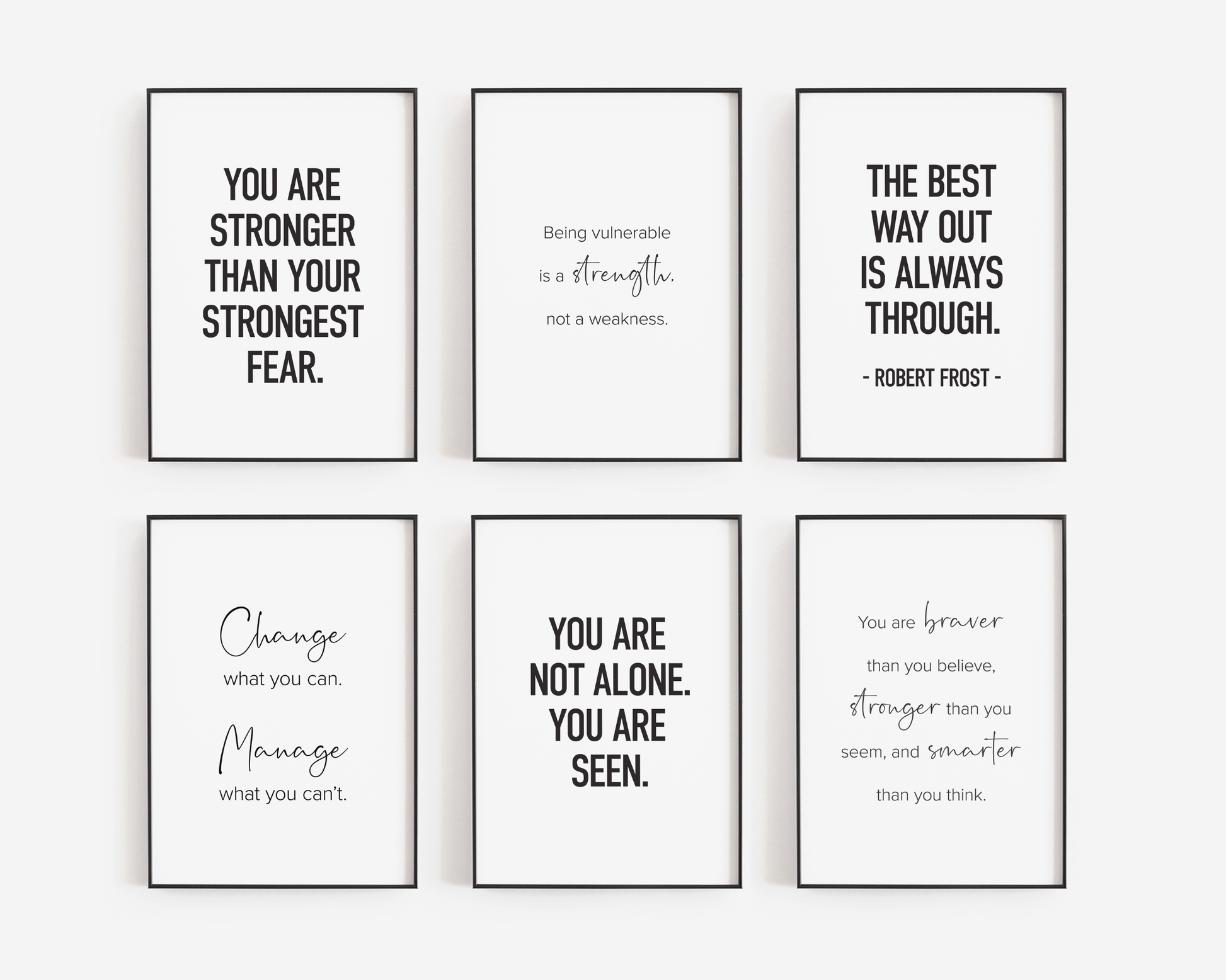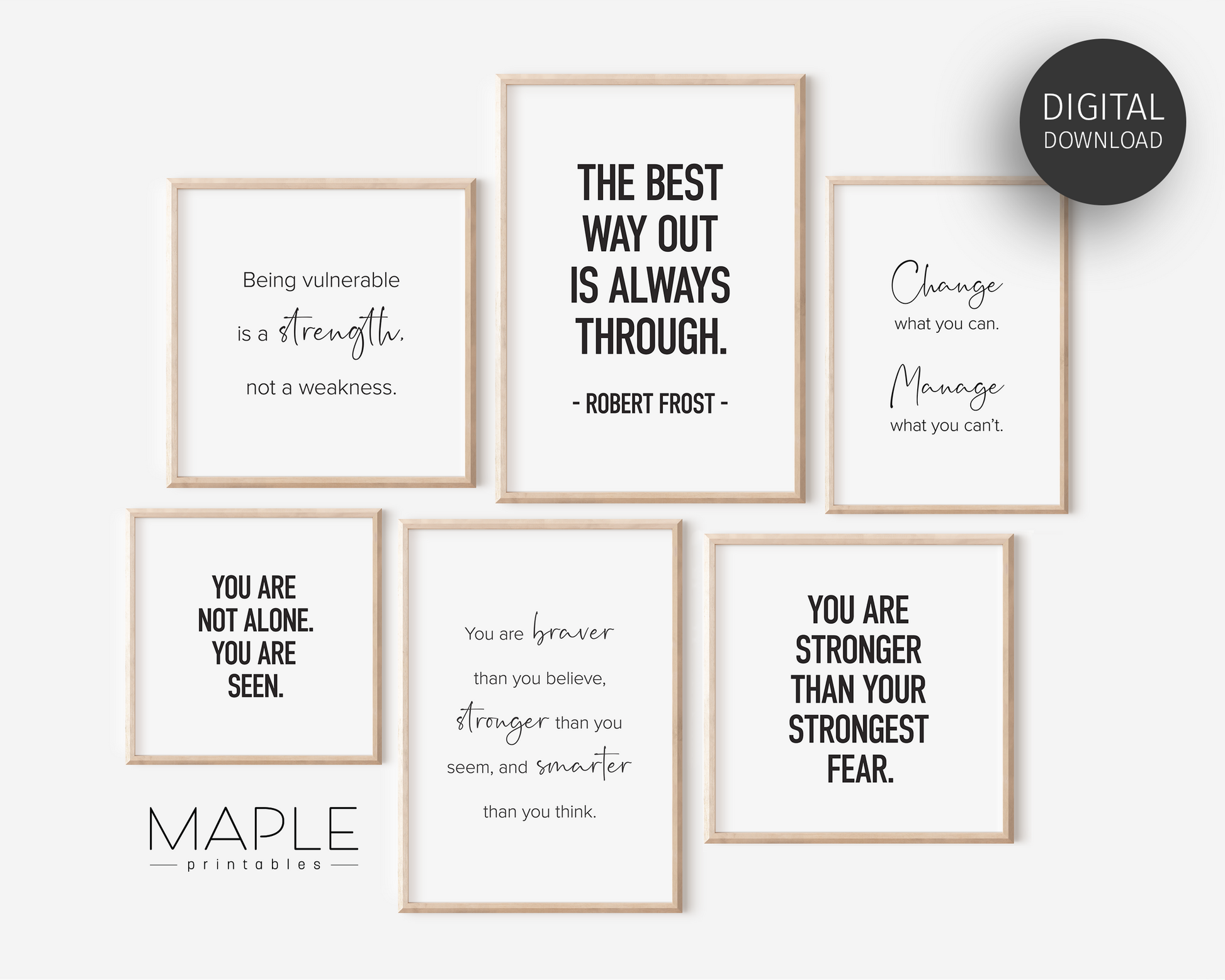 PRINTABLE SET OF 6 PRINTS - Download and print this therapy gallery set to update your office decor in minutes. It features 6 motivational mental health quotes and would be a great gift for a therapist or any friends & family who are studying to become a therapist or psychologist - these prints would definitely add encouragement to their office! The bundle includes 6 vertical prints, available in square format as well, so you can decorate your workplace in your own style and layout!