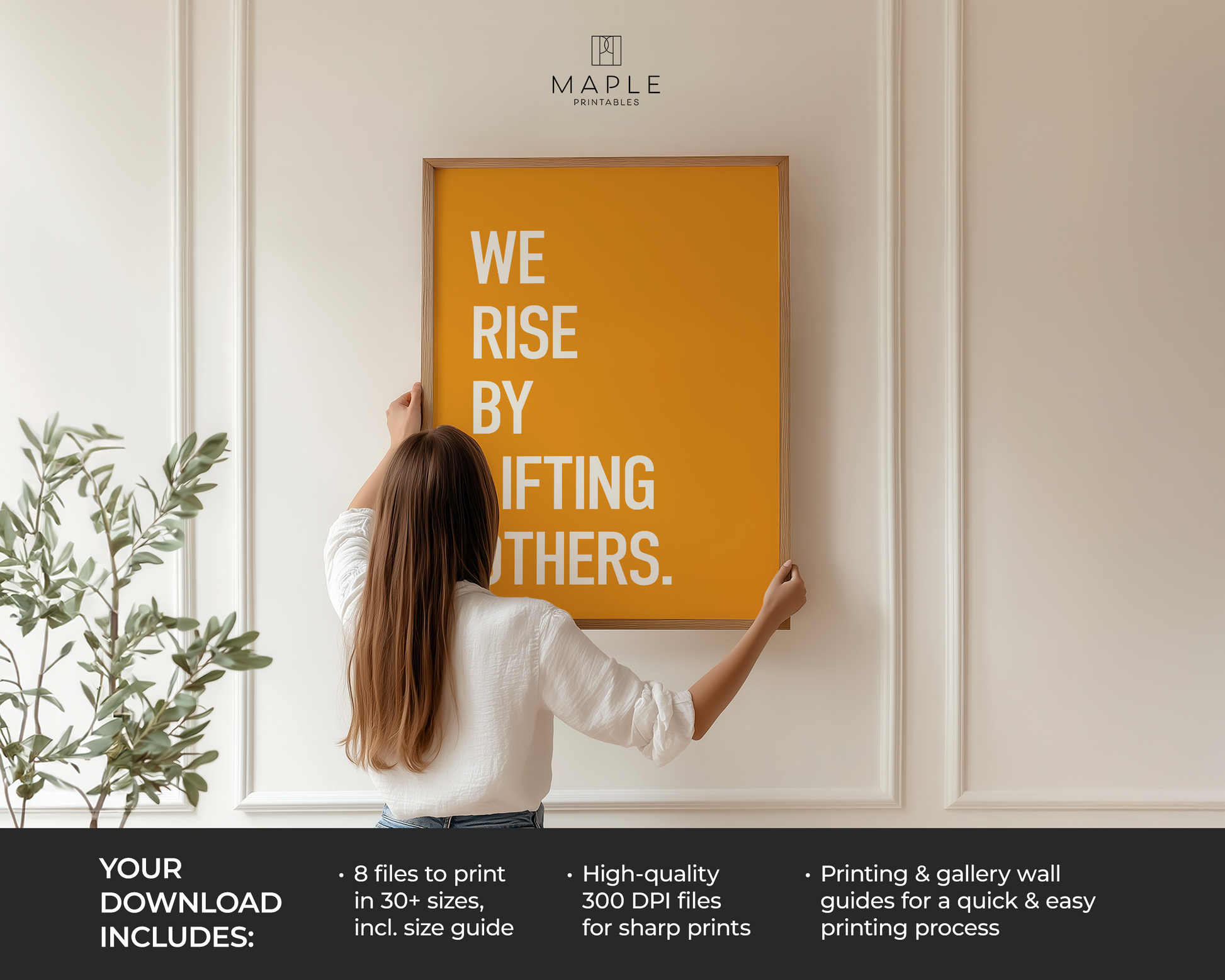 PRINTABLE WALL ART - This yellow teamwork print features the motivational quote “we rise by lifting others.” The colourful office poster is designed to improve team culture, encourage collaboration, and promote positive leadership. The minimalist design makes it a great fit for any space, including offices, break rooms, staff rooms, co-working spaces and classrooms.
