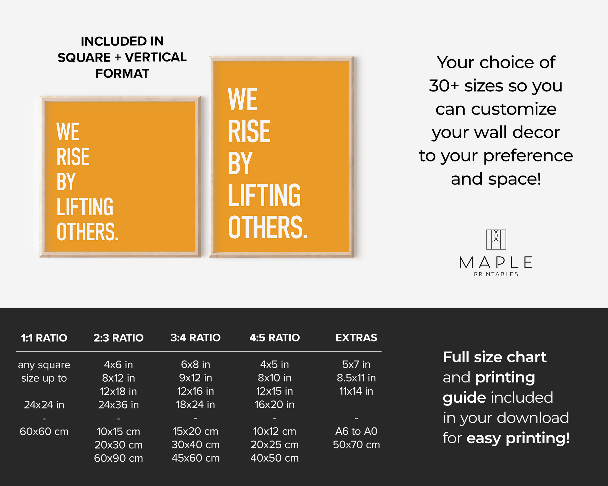 The print is available in 8 files that cover 30+ sizes. It's super easy: download, print (home, print shop or photo lab), frame and display!
